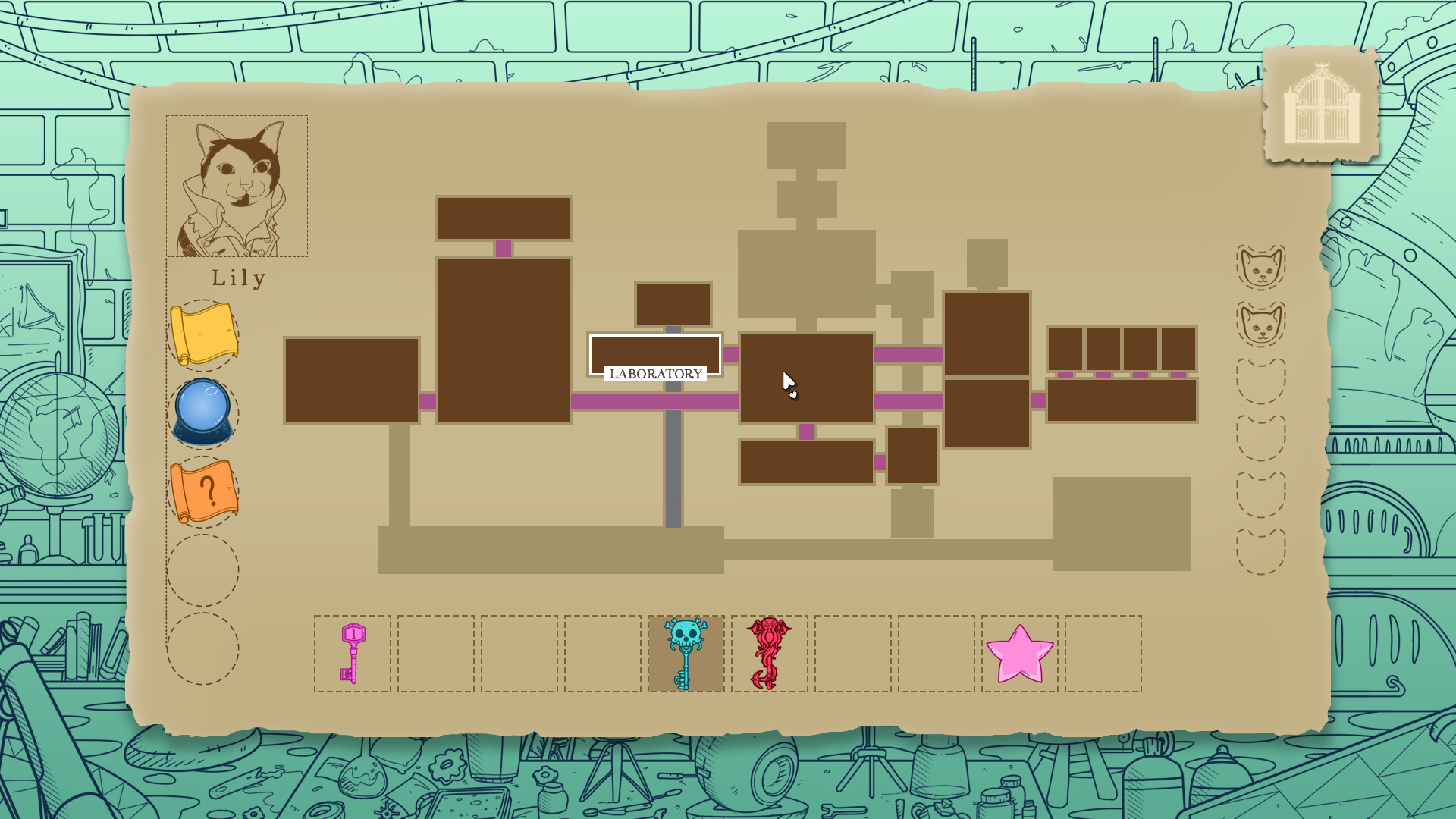 A Castle Full of Cats is a hidden object game with a metroidvania structure: alternate paths, keys to be found, mysterious NPC’s and so much more! Fofiño found himself cursed by an evil force and had transformed every cat in the castle into a dark (yet cute) creature. Now only Lily can save her soulmate and release the castle from the spell! Actually, I just wanted to take a quick look at the game during my lunch break in order to play it at home, but how could it be otherwise, nothing came of it and I played through the game almost in one go and in about 2 hours . I can’t say whether each of you needs the same amount of time. I’m sure someone with full eyesight can do it in less time. In addition, in one room, more precisely the library, I really had trouble finding the last missing cat. In hindsight, I would rather dismiss it as the “I couldn’t see the forest for the trees” moment, but it still took a lot of time. As usual, you advance in the game by finding enough of the cats that have been transformed by an evil force into dark yet cute creatures. Once you have reached this, other areas in the castle open up. However, it is up to you whether you first discover all the cats in the respective area and send them love in order to transform them back and only then move on, or whether you do this immediately.