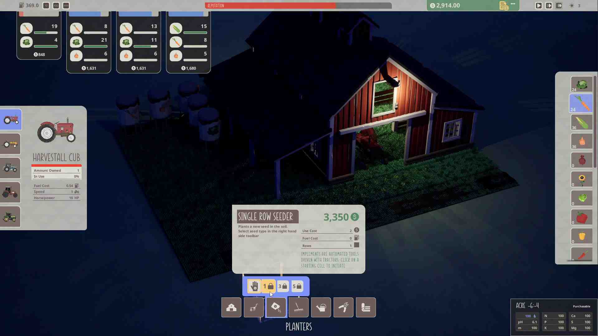 Maintain soil health to prevent resource depletion by using soil amendment tools. Adjust water levels, pH balance, and nutrients to suit each crop’s needs. Your stewardship ensures a continuous cycle of fruitful harvests. Harvest in Abundance: Watch your efforts bloom as plants mature. Utilize state-of-the-art harvesters to gather crops at their peak, reaping the rewards of your hard work. Manual hand tools can be upgraded to automated tractor and implement versions, allowing faster processing times and freeing up the player to manage other areas of the farm. Better tractors and implements have increased usage costs, it is up to the player to decide when upgrades are necessary and cost effective.