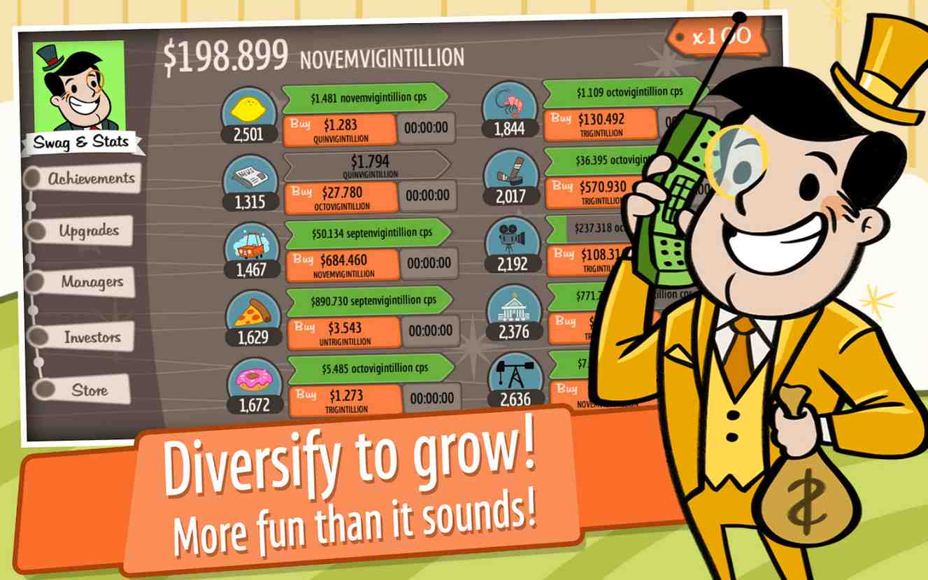 AdVenture Capitalist is a popular idle game where players take on the role of a budding entrepreneur, starting with a single lemonade stand and working their way up to owning a massive conglomerate of businesses. The game’s focus is on earning as much money as possible, through a combination of smart investments, efficient management, and shrewd business decisions. Gameplay: The gameplay in AdVenture Capitalist is centered around managing and growing a portfolio of businesses. Players start with a single lemonade stand, and must use the profits earned from this business to invest in new and more lucrative ventures. As players progress through the game, they will have the opportunity to invest in a wide variety of businesses, ranging from ice cream trucks to oil rigs. Each business has its own unique set of attributes and earning potential, and players must carefully consider which businesses to invest in and when to maximize their profits.