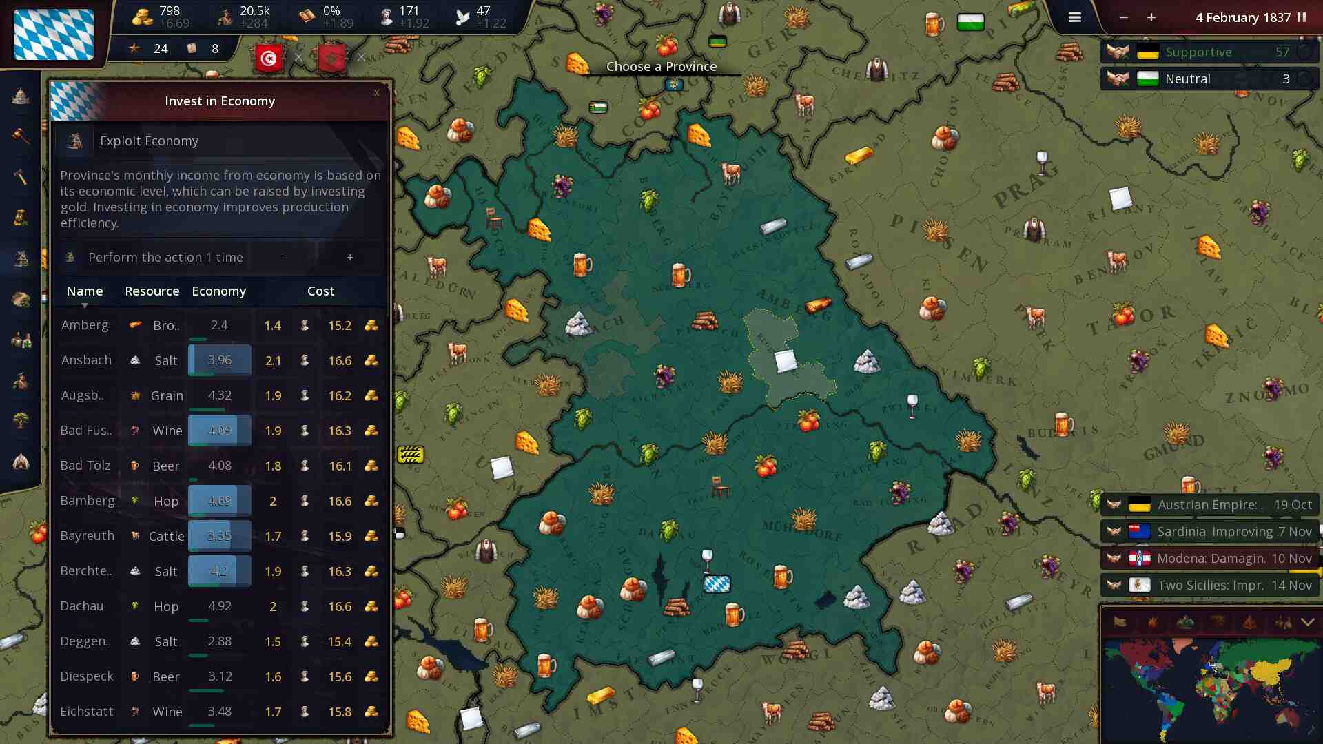 Each day, the front-line units of both armies engage in combat with the enemy’s front-line, provided they are within attack range. Simultaneously, the second-line units also participate by attacking the enemy’s front-line units if they fall within their range. The combat results in casualties, the retreat of troops, and the loss of morale. Manpower represents the stock of individuals eligible for military service within a Civilization. It is a critical resource used for recruiting new troops and reinforcing existing armies, embodying the Civilization’s capacity to wage war and defend itself. Manpower replenishes over time, reflecting natural population growth and recovery from previous military engagements.