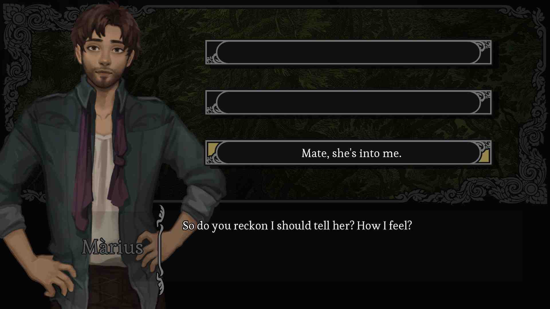 Arik’s been told two things all his life: a tyrant is ruling the country, and somebody needs to do something. Now forced to flee his house after a midnight attack, his parents captured and his house torched—maybe somebody means you. It’s time to gather a party, head to the capital, and take the Lord down. Along the journey, this crew of old friends and new strangers will grow closer—or further apart—as your choices guide Arik to win friends, make enemies, play matchmaker, and break hearts. Announce your brilliant plan…then glimpse a party member silently rolling their eyes in the corner of the screen Learn to correctly pronounce someone’s name, permanently updating the UI Nickname your lover after the stupid thing they said that one time Learn how to make your friends laugh Have a poorly judged hookup really early on and then spend the rest of the playthrough awkwardly trying not to address it Experience the thrill of almost, but not quite, holding hands with somebody you love Make one bad decision and then try to redeem yourself while everyone makes snide comments.