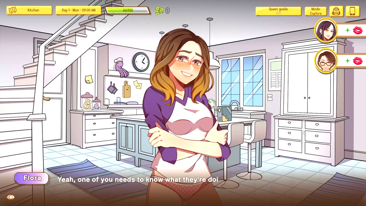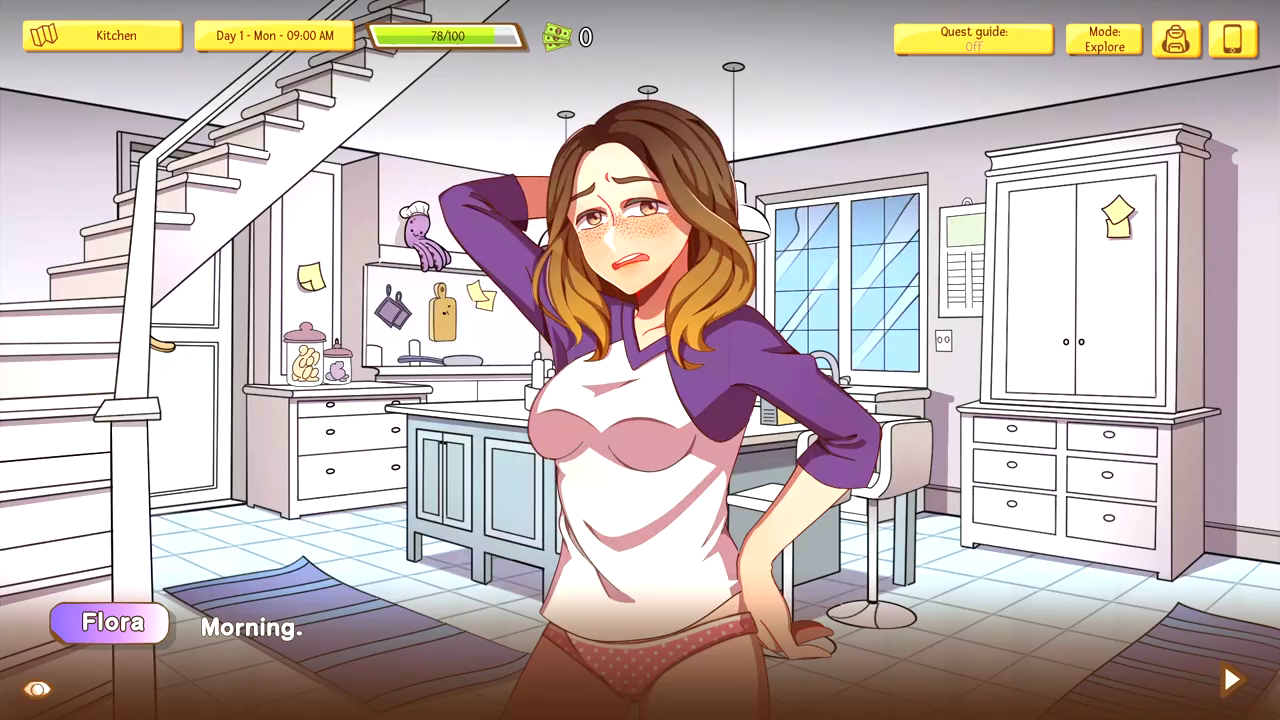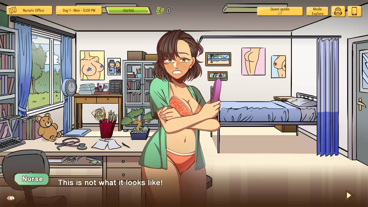 You have several general stats and love and lust stats for specific girls, which will determine what choices you can pick. You can upgrade some of them by finding items in the world, but mainly it will be determined by what choices you choose. Some choices are also only open based on a choice beforehand, meaning there are basically branching routes, but not in a specific sense. However, none of the routes or story itself seems mostly finished at its current state, although there is still a decent amount of content storywise. As a result of its pacing though, there aren’t a lot of lewd scenes as one might expect. The gameplay loop involves moving around the game’s setting and interacting with the girls to start or do quests. You can “talk” and answer a few questions, but it’s very barebones and basically unnecessary currently.