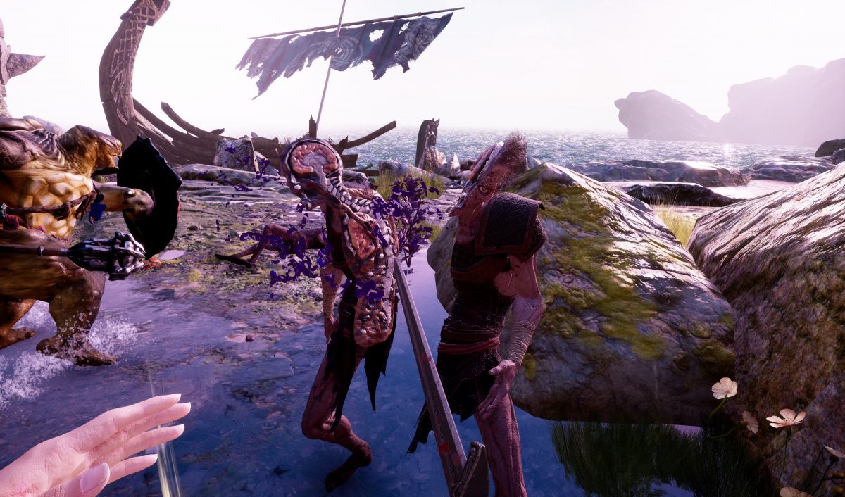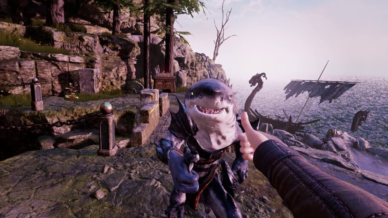 Asgard’s Wrath is an action role-playing game designed for virtual reality (VR) headsets. Set in the Norse mythology, the game sees the player assuming control of a Norse god who is under the tutelage of Loki. The God must fulfill Loki’s request to guide several preordained mortal heroes to fulfill their destinies.[1] The game features five different heroes, each with its own play style and special abilities. Each hero has their own weapon, though weapons can be picked up from defeated enemies. Players swing their sword to defeat enemies and parry to deflect attacks. The weapon can be thrown at enemies and magically summoned back to the player’s hand. Some of these weapons have status properties such as lightning and poison. Players need to consume food to restore health. As players explore, they can complete side missions, explore dungeons and find treasure chests and crates that can be used to craft useful materials.[2] Players can also recruit various animals and transform them into humanoid companions, known as “followers”, who can assist the players in solving puzzles and combat. Loki must give the player the ability to do so.