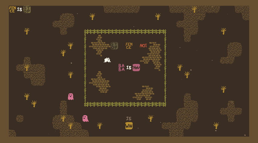 Baba Is You is an award-winning puzzle game where you can change the rules by which you play. In every level, the rules themselves are present as blocks you can interact with; by manipulating them, you can change how the level works and cause surprising, unexpected interactions! With some simple block you can turn yourself into a rock, turn patches of grass into dangerously hot obstacles, and even change the goal you need to reach to something entirely different. The game has over 200 levels that experiment with the game’s mechanics in a multitude of ways, requiring the player to understand and manipulate the rules of the game and figure out devious ways to make the objects in the game world interact.