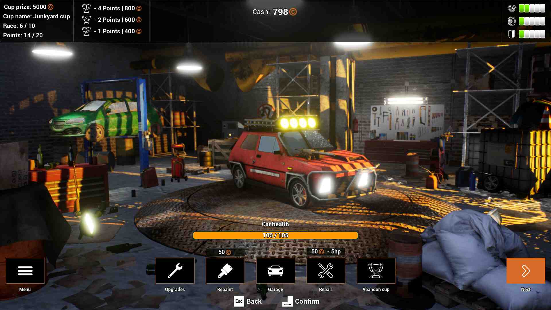 Barely Racing is an isometric view racing game, inspired strongly by Death Rally and other old-school racing games. However, we spiced it up a bit with online play and weapon choice. 7 cars, with color customization. 9 tracks, with reverse variant, across 3 biomes. Machine guns, rockets, and mines are your weapon of choice. Game is primarily made to be played in split screen, but there is a story mode too. Online multiplayer is supported, but it is peer to peer, which means your online match quality highly depends on the person who created the server. Single player story where you race to win the cups? LOCAL AND ONLINE MULTIPLAYER This game is meant to be played with your friends. Don’t hesitate to challenge them. It is not a surprise that games like these are best enjoyed in multiplayer. Race – just a regular race like any other. Addition of mines, rockets and machine guns, might change that experience a bit.Mine Tag – good old tag game, but this time you carry a mine that has a timeout. Better hurry up to touch (tag) someone before it explodes.
