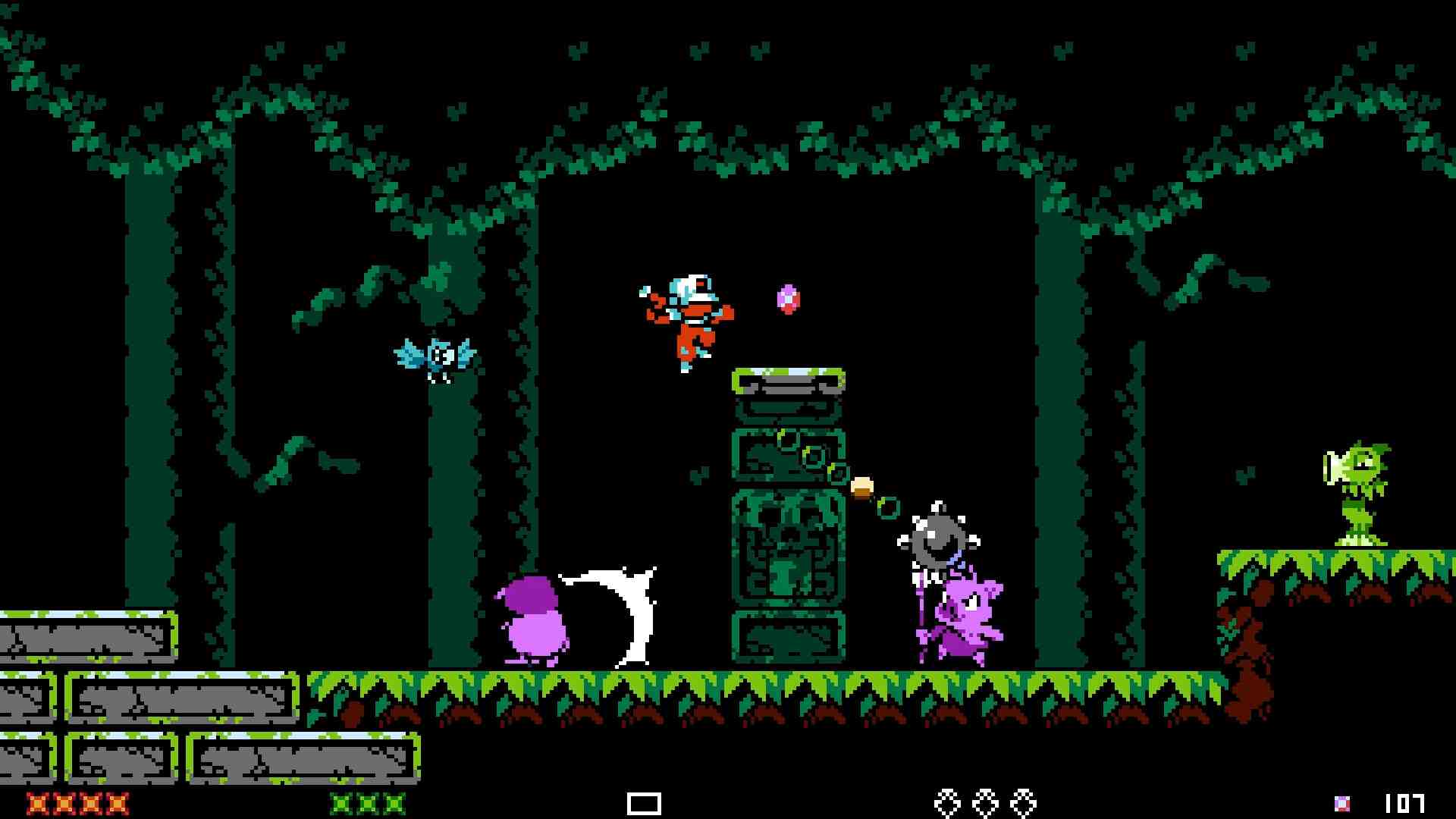 We jump, hit with our bat and hit projectiles to throw them back. Jumping on the head of enemy works rather good, especially when fighting bosses. The game is divided into levels, the levels are divided into single screens. Re-entering a screen revives all enemies. Quite retro design, but if we finish a level the game is saved so you don’t replay level 1 again and again like in so many platformers from the 80s. Additionally, checkpoints inside the levels save the progress during a gaming session.