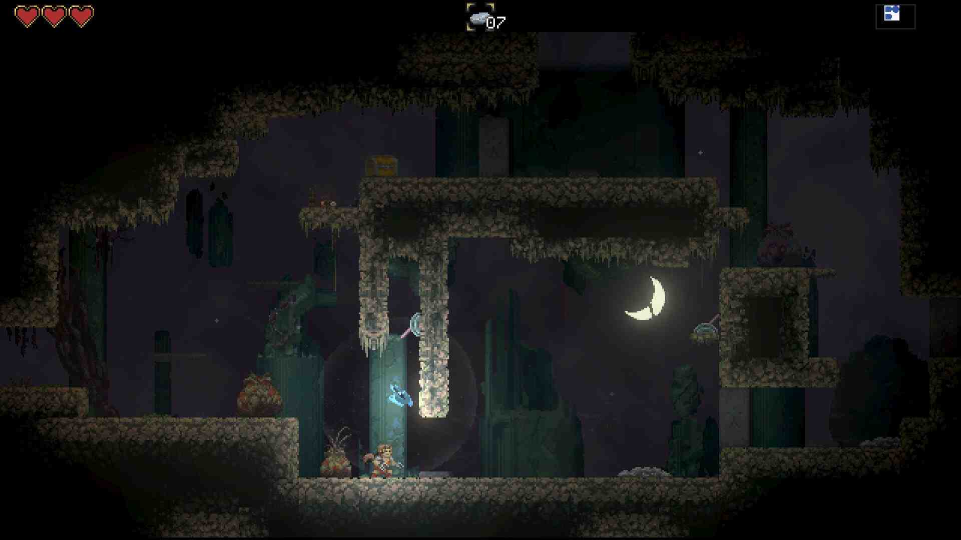 Exploration is done like any standard Metroidvania, you’ll progress through a maze like cave with certain areas being restricted, requiring some ability to gain access to it. Getting lost or not really knowing where to go next is somewhat part of the experience, giving off a sense of satisfaction when you finally figure out where to go next (or feeling dumb for not trying to do that sooner). You’ll acquire a handful of different abilities but the more unique one is using your magical bat named Pip. You’ll gain new elements for Pip to change to on the fly, being able to change his aura to fire, ice or neutral. This mechanic isn’t just used to gain access to new places however, you can block enemy projects by using the right element. For example fire can block ice, ice can block fire and neutral can block purple flames, the game utilises this in a number of different ways, most notably with some of the late game bosses that use magic to attack you.