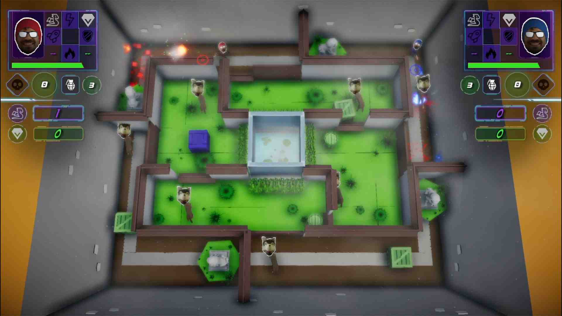 Where would one be without Abilities? Truly one of the Universe’s most important questions. That’s why we gave ya a Teleporter, cause gee golly whizz it sure is neat watching your character zipping and zooming across the screen, ain’t it? Then of course, we just had to strap a ridiculous Super Vacuum to your suit so you can bring those juicy boxes a bit closer a bit quicker and yank away the loot right under your opponents’ noses. In Booom-Slang! you take on the role of one many clones that is kept prisoner by a deranged mad man running a sadistic live death game. Where each clone needs to compete against other clones, hunting as much of the cloned wildlife, while collecting as much treasure in order to appease the evil showrunner’s ratings goals. See, I told you, Fever Dream level stuff…