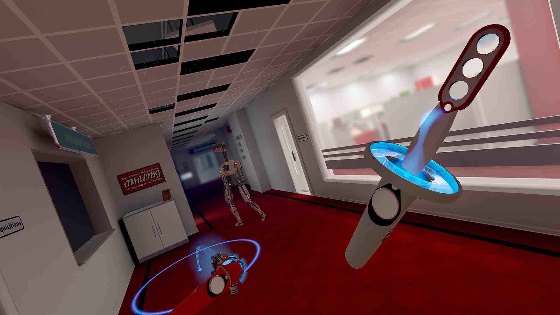 You are an employee at the mega conglomerate TransCorp, and it’s your job to stamp papers and file files! Unfortunately for you, TransCorp is an expert in the business of manufacturing cost-cutting robots, and now you are about to be fired. Built for Virtual Reality from the ground up, Budget Cuts is a stealth game set in a dystopian office-scape with tons of evil robots and even more knives (for throwing and stabbing them with!) Use your TransLocator gun to teleport through the many departments of TransCorp. Sneak around corners, hide behind air vents, or go nuts with lots of robot-killing action Budget Cuts Arcade (accessed through the arcade machine in the main menu room) is a free update that now comes with the base game automatically, and adds four new bonus levels to the game, new difficulty levels, as well as a new Arcade Game Mode with high scores for the.