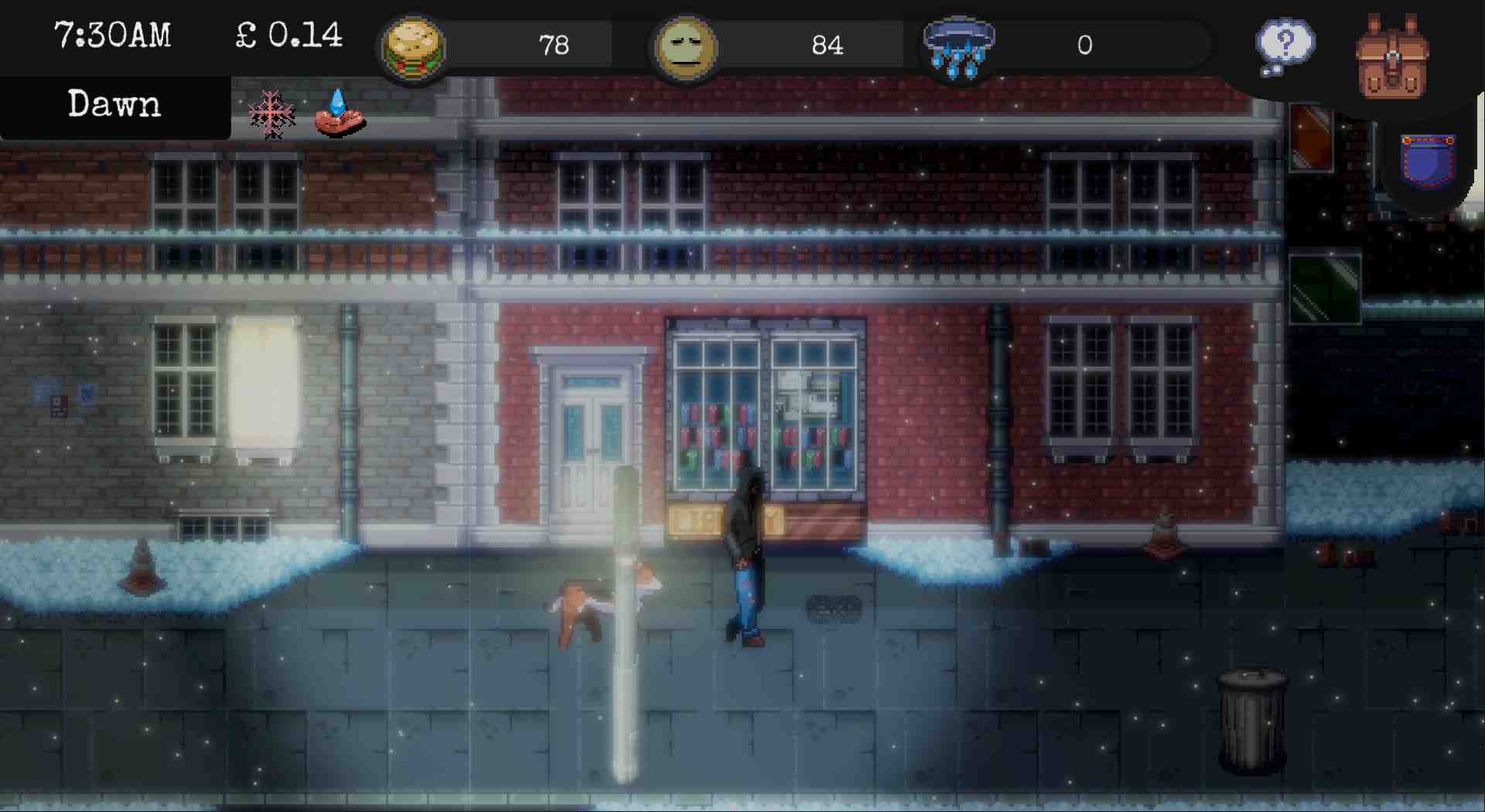 Manage your hunger, hygiene, happiness, crime levels, street reputation, study levels and other stats as you try to survive and escape the homeless life. But you can only do so much in one day… what will you do? Will you spend the day begging, depending on the kindness of others? Will you find shelter in the night? Perhaps you’re moved out of the area by the police for loitering. Unable to find shelter, you end up on the streets at night, and you meet a dog. Is it a stray? Could it be a friend? All your actions affect your happiness in some way, and it’s up to you to manage your stats accordingly. You could turn to drink, but risk addiction. You could hope for a fortunate event, or make some progress towards your survival. But you will have to choose. It could all be over if a bad event occurs in the dangerous night streets. Especially during winter.
