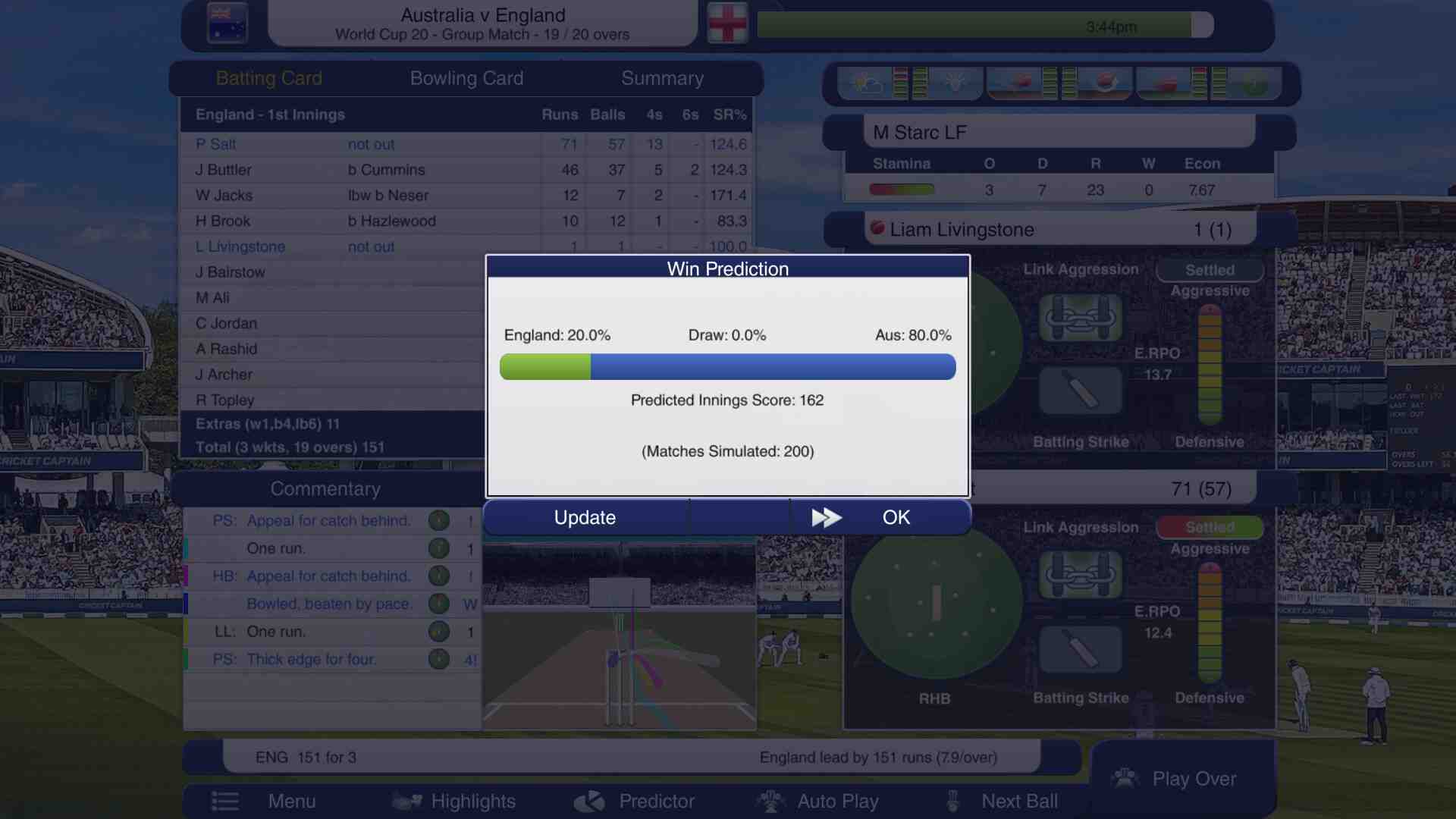 Commentary: new commentary from Daniel Norcross. Score Predictor: in-match score and win predictor. Honours Boards: every international 5 wicket haul or century, in all 3 match types. Match Engine: improved following user feedback and simulations. Updated International Team Rankings: calculated from last 4 years results. New Kits: updated international kits. International Player Rankings: updated with historical data. Asia Trophy: play in ODI and 20 Over International tournaments. Updated Pakistan Domestic System: Eight new teams. Domestic System Updates: all systems updated to latest rules and formats. Improved Player Generation: rebalanced with focus on player aggression. Test Championship: updated for the 2024 season. Tournament Modes: play in stand-alone One Day, Asia Trophy or 20 Over World Cups. Create your own World XIs, All-Time Great and Custom Match Series.