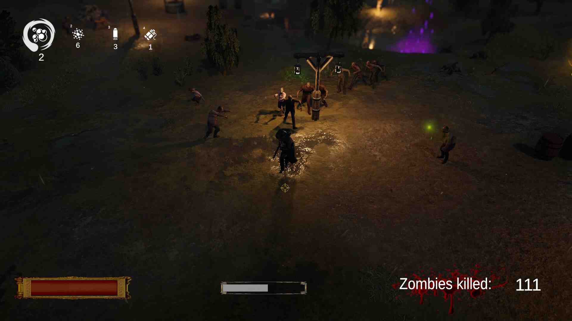 Dead Mire is a unique atmospheric fast-paced endless wave zombie gore fest. Ammo is scarce so you must use it tactically to dispose of as many zombies as you can with as few shots as possible. You are armed with a double barrel shotgun and you can switch between buckshot, birdshot and slugs which you must choose between wisely to maximize your damage output in any given situation. Birdshot gives you a very wide cone but short range, ideal for taking out swarms of zombies grouping you. Slugs have long range and will pass through objects and other zombies but travels in a narrow line, best used when you line up zombies behind one another. Buckshot is a balance between range and width; your bread and butter for taking out zombies along with barrels and crates. Make use of portals and bullet time to extend and break up shots, killing more zombies in a single shot. Ammo and health potions spawn from broken barrels and crates which can also be destroyed with teleported shots, traps and dynamite, maximizing your ammo conservation.