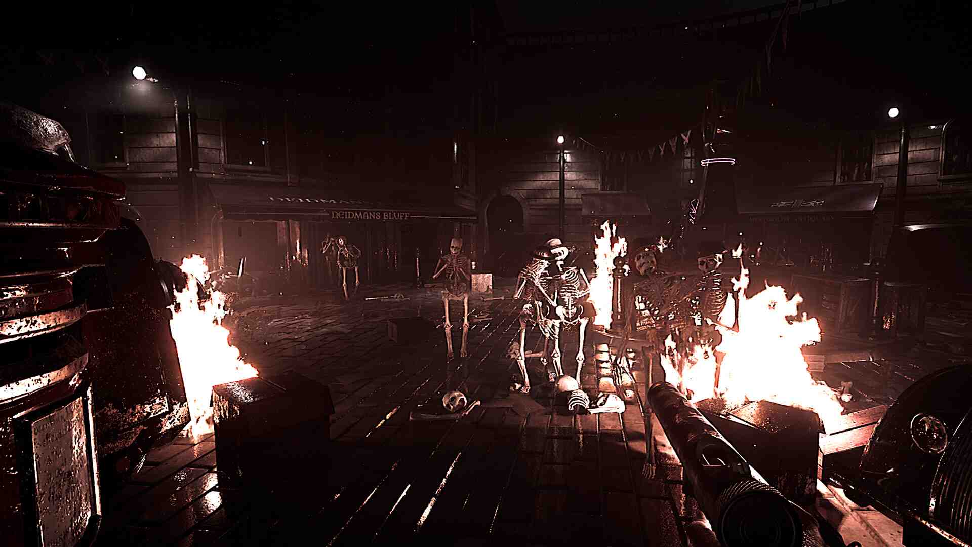 The user interface is slick and easy to navigate. Love the dark and spooky atmosphere. Those skeletons casually chilling at the tables tricked me good a couple of times haha. The graphics are really decent for an indie game, the details in the environment are impressive and I like the wide variety of weapons too. The inclusion of a snow map gave the game a seasonal charm as well. For this price the game delivered a solid gaming experience so far! A thoroughly addictive game. and never has lasting 5 minutes in a game brought such a sense of achievement. It certainly is challenging. Each game something new is learned about how to survive, where the keys could be, where the safe spot is to take a breather ( and where not to go!) – all help the strategy for the next game. Upgrades are essential, get points or crowns and use the various machines to get weapons or other artefacts ( not quite sure what they are for yet.