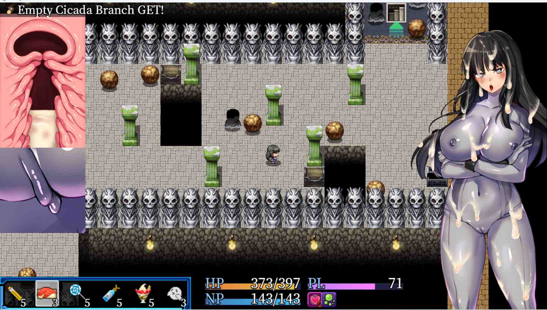 However, if you start a fight accidentally, there is a high chance that you will lose…And you will watch the great sex scenes! In battle, the target is constantly being sexually harassed and exhibits different stances. As the pleasure level increases with sex attacks, the damage taken increases and your HP drops more easily. When your HP hits 0, you will be penetrated and creampied, but your HP and NP will be restored. The game will end when your womb is full of semen.