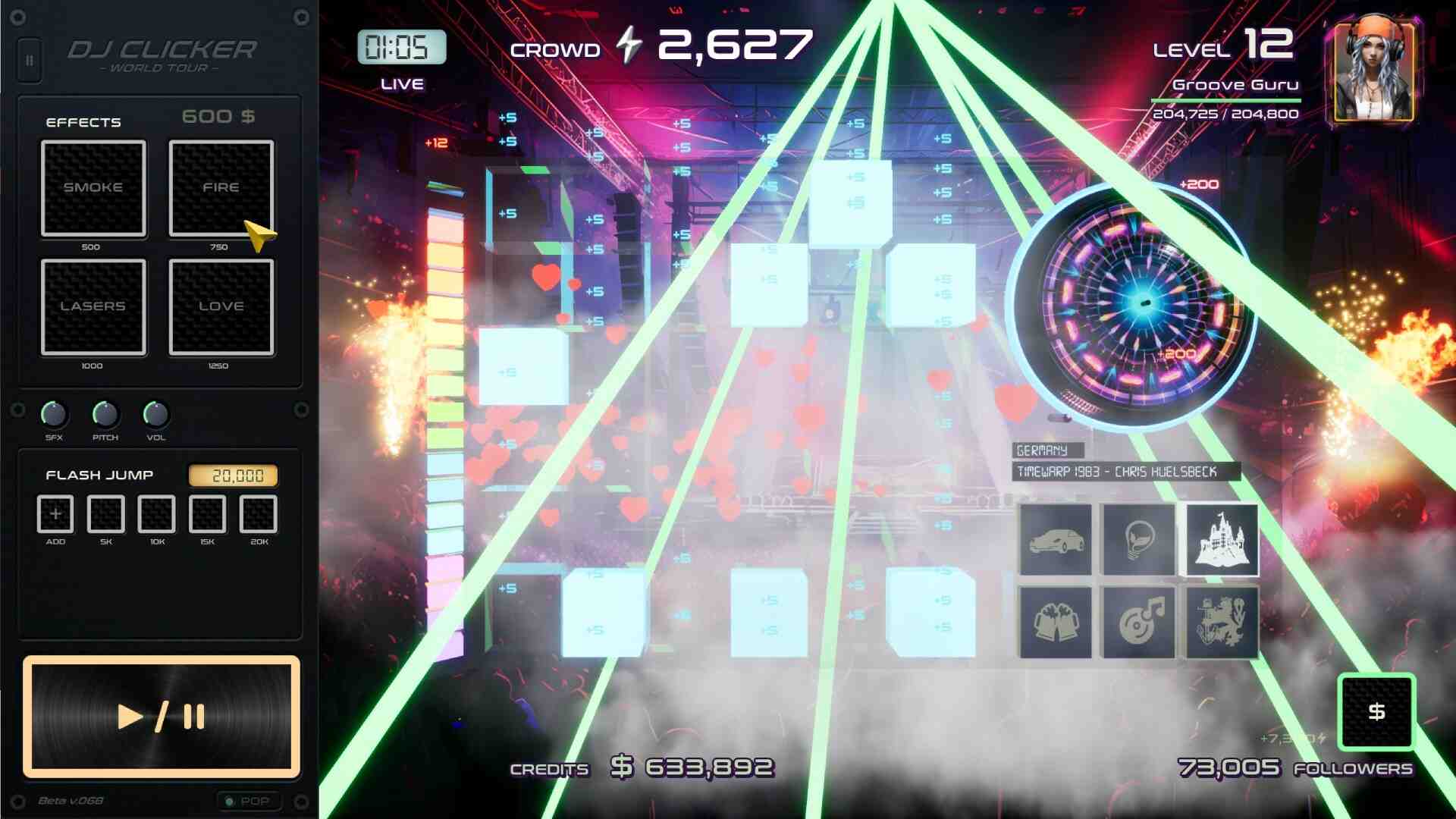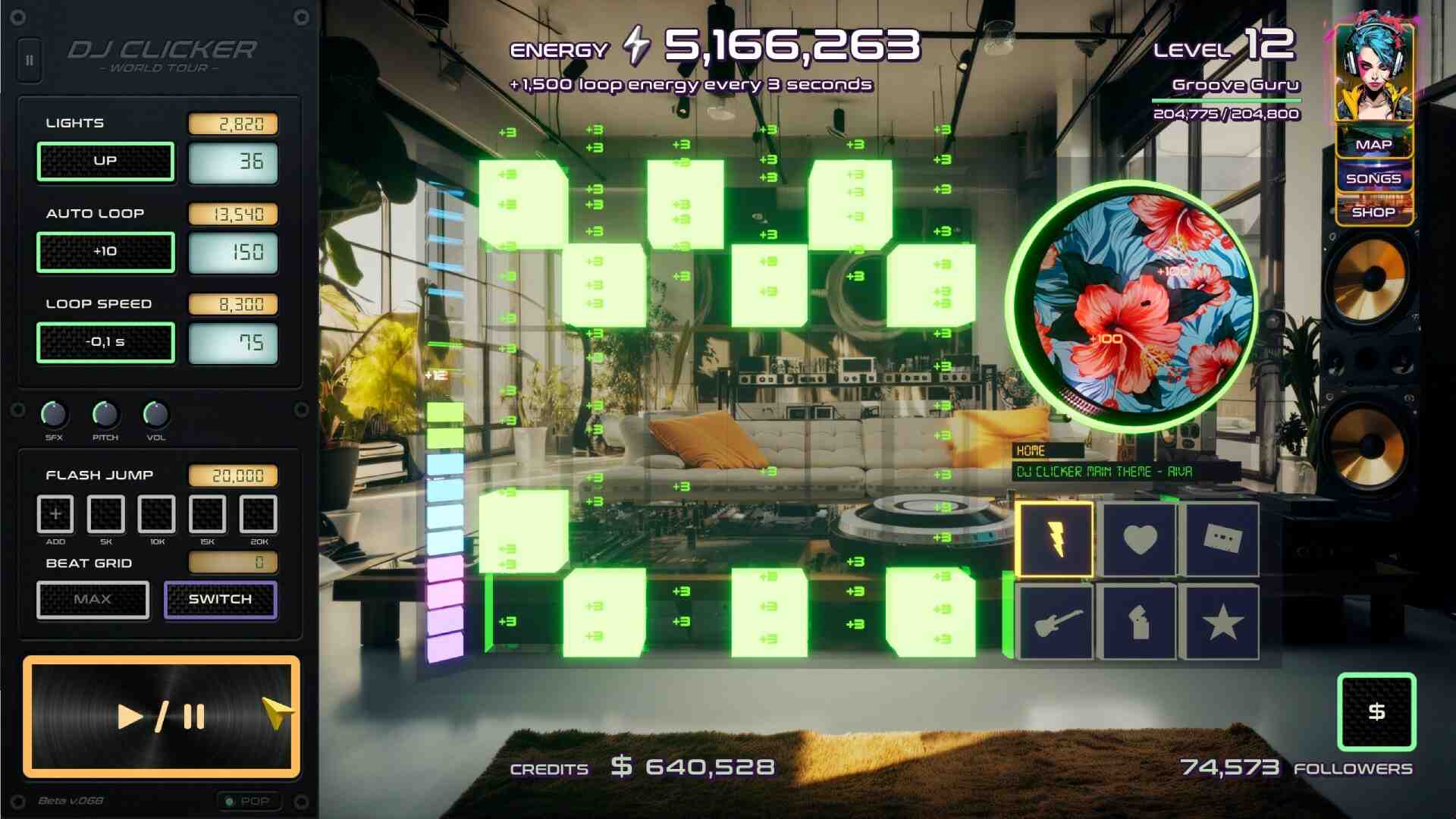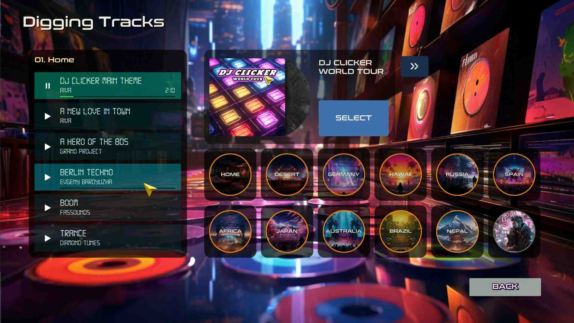 DJ Clicker – World Tour is a game about you and what you’re gonna do with your life. You can travel the world and become a famous star DJ, but you need to have the energy for it. Hit the lights and set up your loops until you’re pumped up enough to take it to the stage. Collect tracks and fame to play the biggest venues. The game is all about electronic music composed by artists from all over the world. There will be 72 tracks to unlock as well as different vinyls, record covers, locations and residences. It also includes 2 brand new tracks from famed games music composer Chris Huelsbeck (Star Wars Rogue Squadron, Turrican, Giana Sisters). If you love music and want a game with no fighting, then DJ Clicker is for you. Here is a small preview of some of the records you can collect: Fantastic game with lots of cool music and stylish graphics. It’s a somewhat unconventional clicker with a funny story that takes you to unexpected realms. The game is super fun, whether you just chill and enjoy the music and light effects or go crazy clicking away.