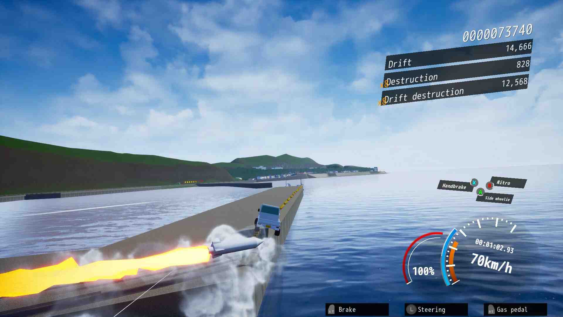 Since you will not be damaged by anything other than enemy attacks, it doesn’t matter whether you crash into a wall due to overspeed or fall into a river. Rather, you earn points by knocking off regular cars, signs, obstacles, etc. on the road, and there is also an online ranking of points in addition to the time, so it is reminiscent of RUNABOUT where you can stoically shorten your time or engage in destructive activities. The advantage is the high degree of freedom that allows you to But you were not transferred under the influence of a mysterious energy. The stage is set in a town or countryside where there is no sign of people at all. Currently, it is a bit rough around the edges, as you should expect from Early Access, but with some polish, this could really be a gem. Nobody is in the buildings or in the cars. Aliens who disturb you by destroying buildings and attacking you will be chasing you there. You dodge collapsing buildings, missiles, and attacks from mysterious mechanical life forms with brilliant driving techniques, and destroying utility poles, street trees, and guardrails.