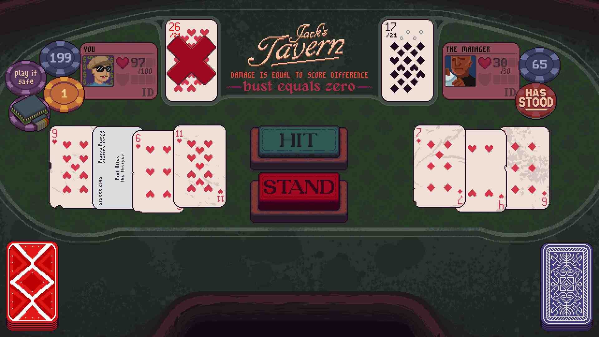 Begin your adventure in a tavern that is home to a unique, corrupted version of blackjack you have never played before. You will need to pick up the rules and adapt to them as you progress through the tavern, challenging a colourful cast of blackjack-addicted townspeople. Discover the mystery of who runs this twisted casino as you progress through the tavern to take them down! Pick a suit: hearts for healing, spades to offer you some protection, diamonds for more currency for shop purchases, or clubs for extra damage. Remove cards from your deck as you progress. Pick up more aces and face cards, or fill your deck with tarot cards, business cards, birthday cards, hall passes and more! Make your way through the tavern challenging patrons, purchasing additional cards for your deck, resting up when your health gets low, opening boosters packs, participating in minigames and much more! Take on the run-based deckbuilding roguelike challenge, with endless possibilities for unique and interesting decks!