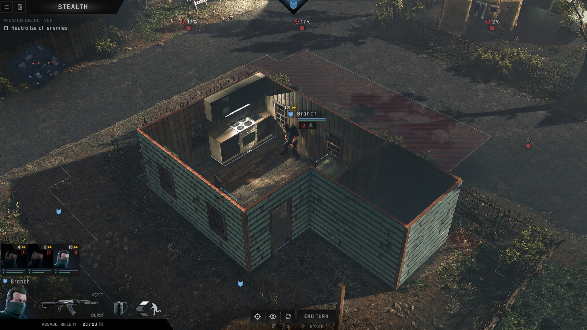 EARLY ACCESS NOTIFICATION This game is still highly in development, if you want to have the full experience it’s better to wait until full release. We hope you will give us feedback during development to help us improve the game. In END STATE you manage an international mercenary company hired to track down a network of terrorists in a war-torn country where warring rebel groups, criminal organizations and private security forces fight for power. REACTION SYSTEM Opportunity Fire triggers a reaction test when an enemy walks in to view. All participants in these situations can choose to shoot which often to intense firefights.