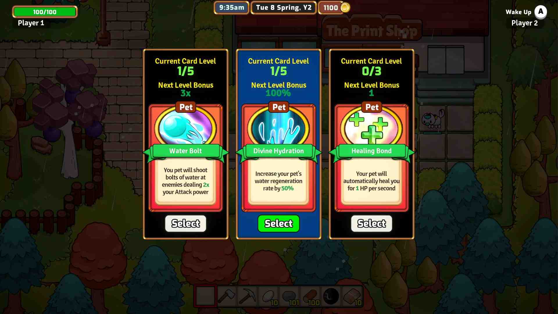 You once had a serene and peaceful existence right here in Everafter Falls. Don’t you remember? You wake up to discover your previous life was nothing but a simulation. You’ve no memory of this place, your quaint animal neighbors, the refreshing wind and fragrant flowers, the little farm you had tucked away just outside town, none of it. But once you spend a little time with your forgotten friends and your helpful pet, doesn’t Everafter Falls just feel perfect? Isn’t it where you always wanted to be? Sure, you’ll need to farm, fish and fight your way back to prominence in the tiny, cozy town, but you know your way around a sword, right? You know how to water your farm and progress through the dungeons. You know how to upgrade your stats and beat back tougher and tougher enemies, don’t you? Just give those cards a good chomp and you’ll have everything you need!