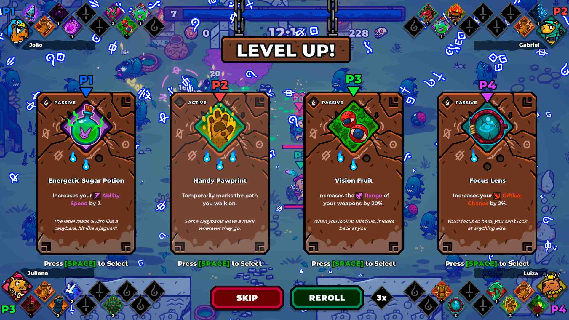 These unique Capybaras will fight for their survival in this chaotic bullet heaven roguelite adventure! Whether you are solo or with a team, face hordes of enemies, collect coins, unlock weapons and skills, and become the mightiest capybaras of all! Unleash the capy-power with a diverse range of capybara heroes, each boasting unique classes, weapons, and combat styles! Whether you’re a mighty Warrior or a melodious Bard, prepare to face hordes of enemies in style! Are you a lone capy-warrior or a squad commander? Take on the adventure solo or team up with your capy-comrades through Online or Local Co-op for a fur-ocious fight! Every run brings a fresh set of randomized skills and passives! Pick the perfect combo to complement your capy-build and make each run a unique and thrilling experience. Mix, match, and conquer! Earned a hoard of Capy-Coins during your daring runs? Time to give your abilities a capy-boost! Visit the Upgrade Shop to exchange your well-earned coins for powerful ability upgrades.