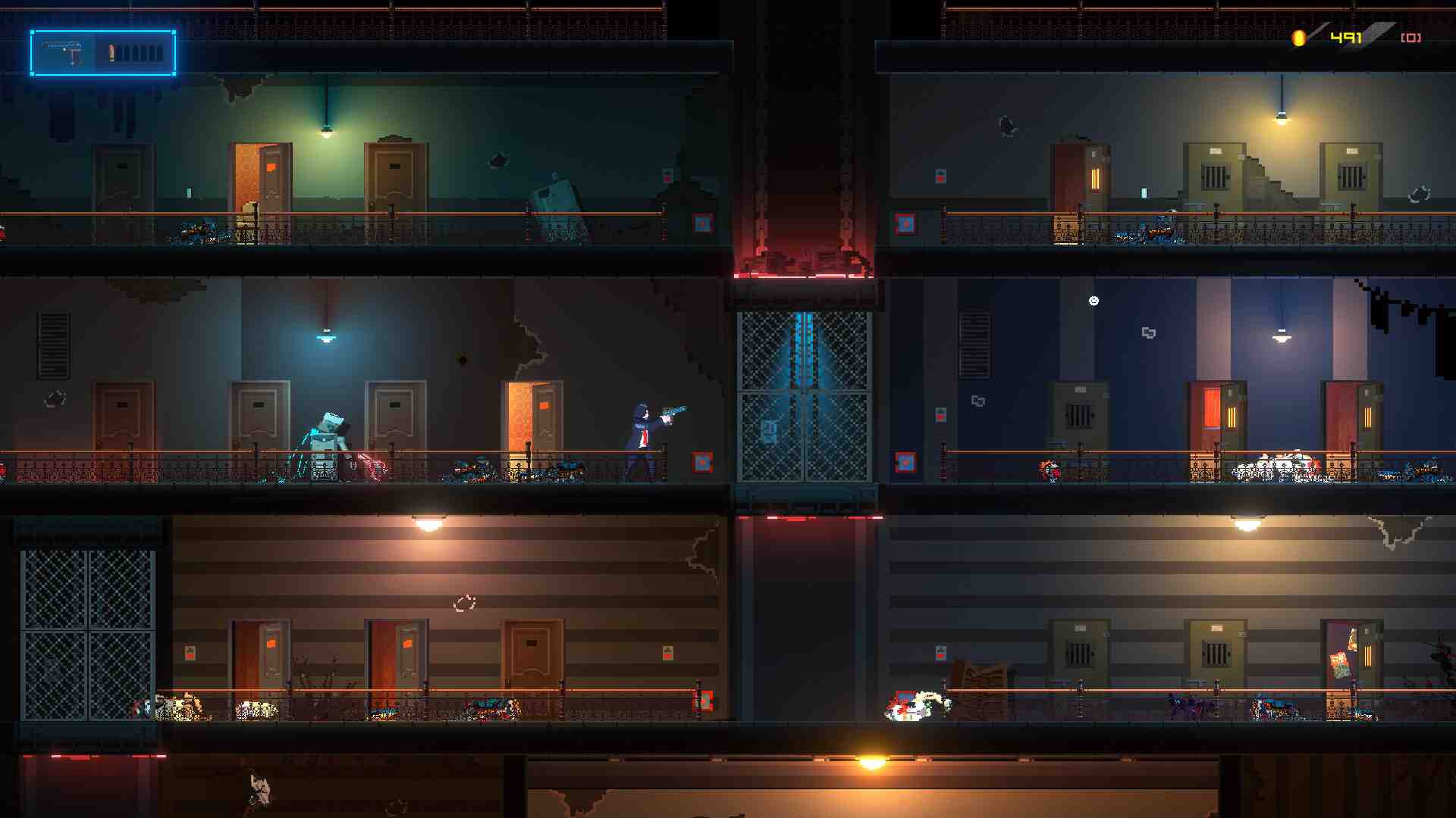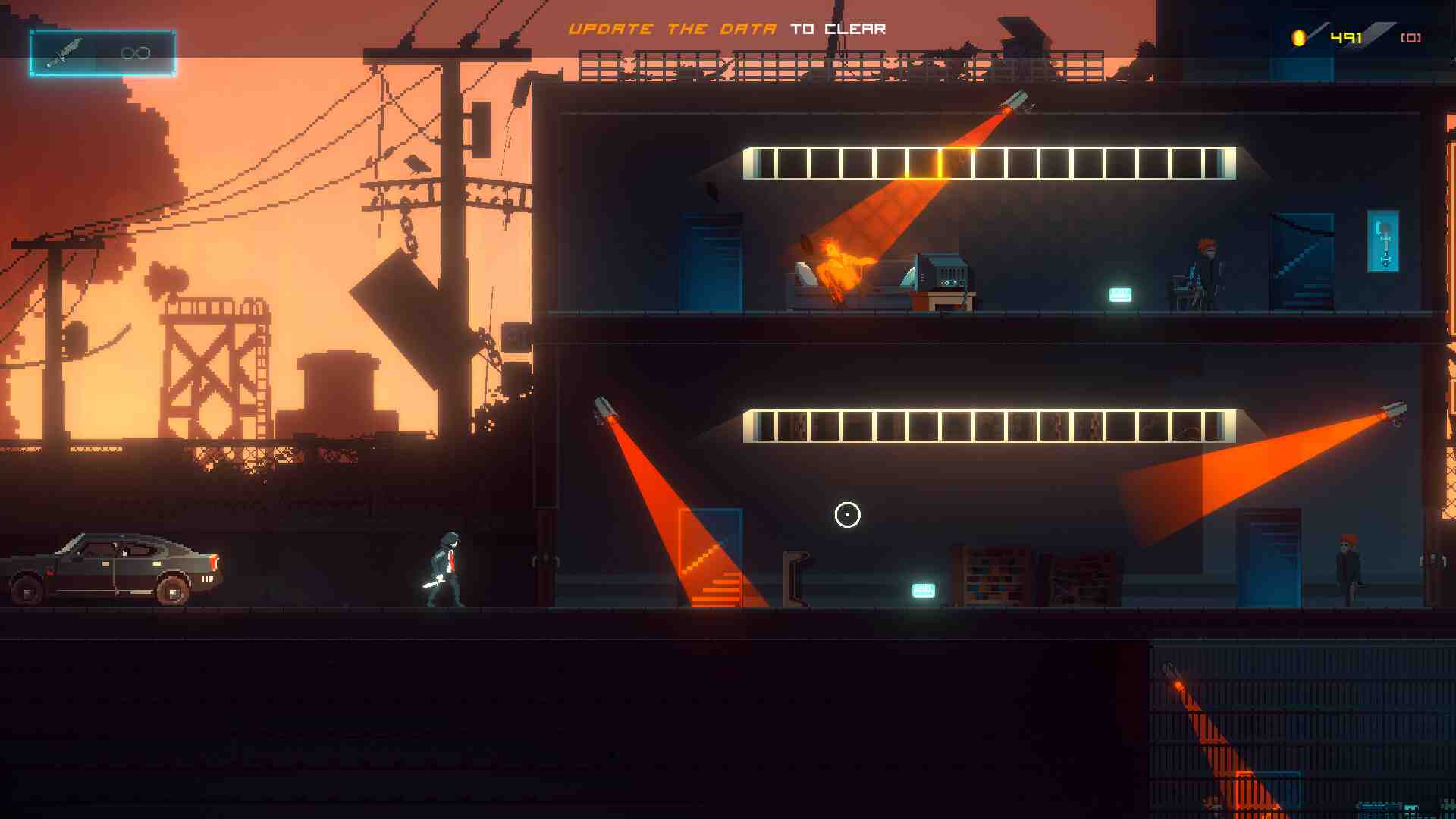 FAKE SIGNALS is an action hybrid rogue-lite that you sneak in the enemies’ camps, get various weapons and eliminate them. Use weapons such as melee weapons, ranged weapons, throwing weapons, mines, explosive barrel, etc. and defeat enemies. Depending on which weapon you choose and which route you choose, you can have different experiences. Find objects you can hide in. There will be enemies’ weapons. Turn on & off the lights, and you can sometimes destroy them. Complete missions by using interactive objects such as controllable elevators and doors that open & close. In-car navigation has a lot of information to help you play fake signals. Information is about each stage, weapons, mails from the helper, soundtracks, bonus stages, etc. Some apps can be unlocked by earning coins.
