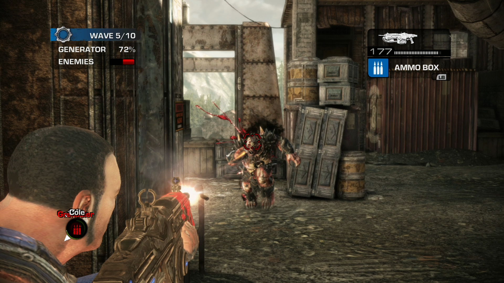 When the player takes damage, the “Crimson Omen”, a red cog representing the player’s health gauge, will fade into the screen, becoming more defined with larger amounts of damage. The player can seek cover to recover their health, but if they take too much damage, they will become incapacitated. Once this occurs, a skull will fill the center void of the omen. The player can then be revived by a teammate, executed by an enemy, or remain incapacitated until they “bleed out”, dying from blood loss. The game features a five-act campaign that can be played alone or cooperatively with another player. The campaign focuses on COG Army soldiers Marcus Fenix and Dominic Santiago and their efforts in the Delta Squad to wipe out the Locust forces on their planet Sera.