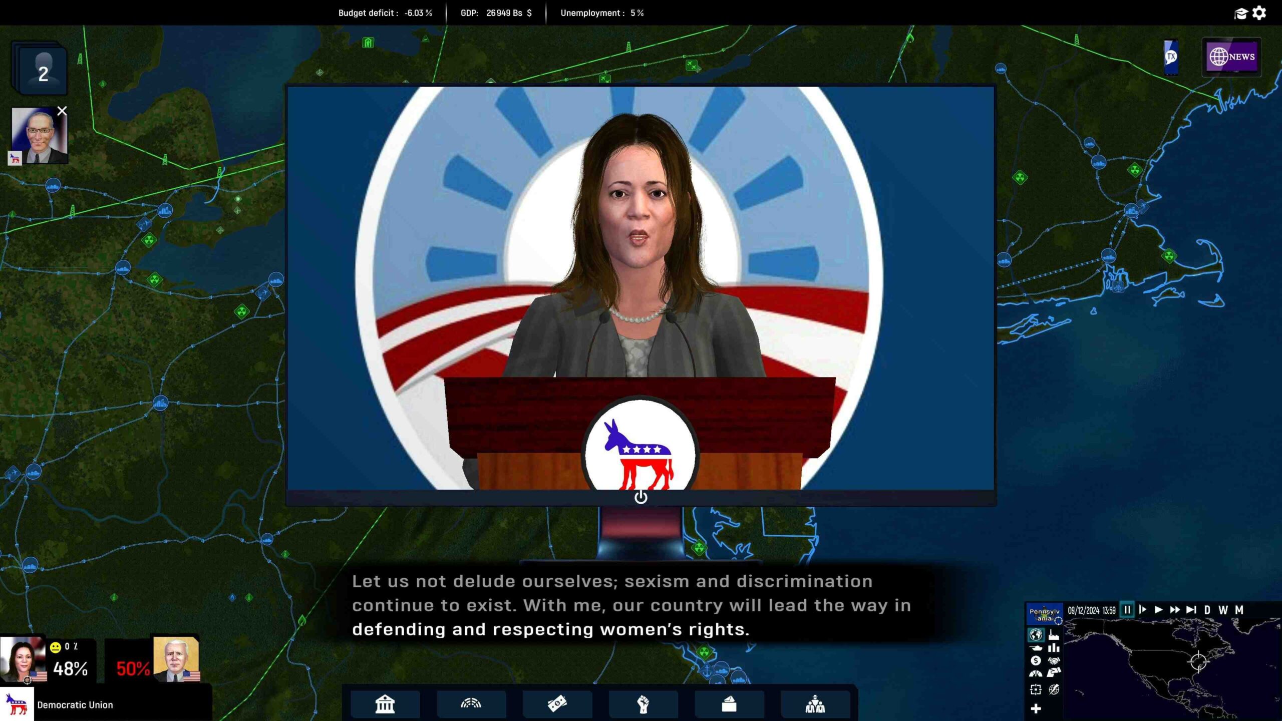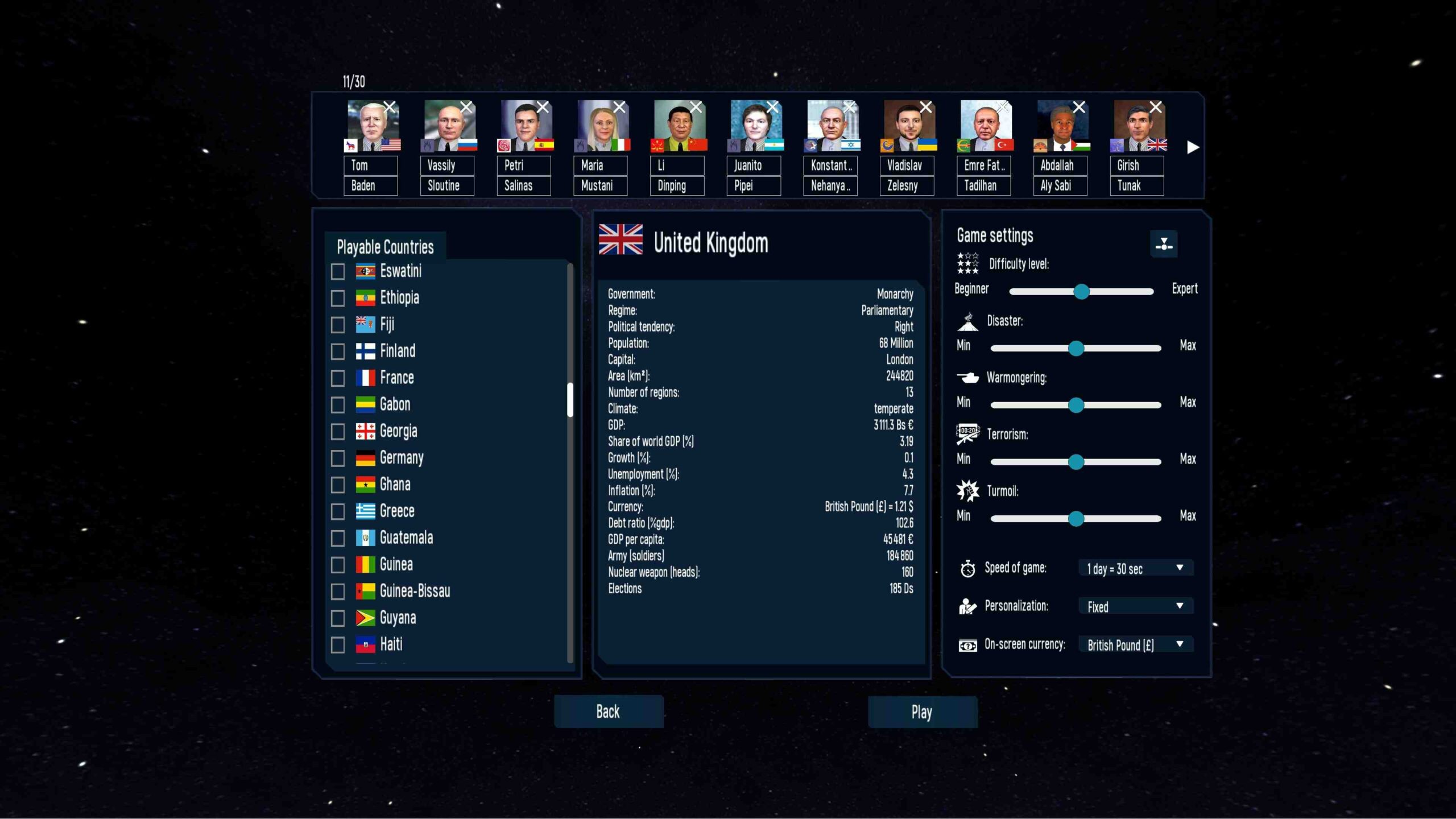 You can opt to control one or more countries or one or more major corporations simultaneously and devise collaborative strategies to change your own destiny or the world’s. Game sessions are customizable in several ways: activity level of terrorist organizations, probability of natural disasters, reactions of the people, outbreak of wars… More than twenty contextual scenarios with current events from today’s world are integrated. The game engine, Geopolitical Simulator 5, includes over 600 data elements for each of the 175 playable countries and calculates their changes in real time throughout the game based on players’ actions. Some examples include popularity ratings, political relations, and economic exchanges between countries.
