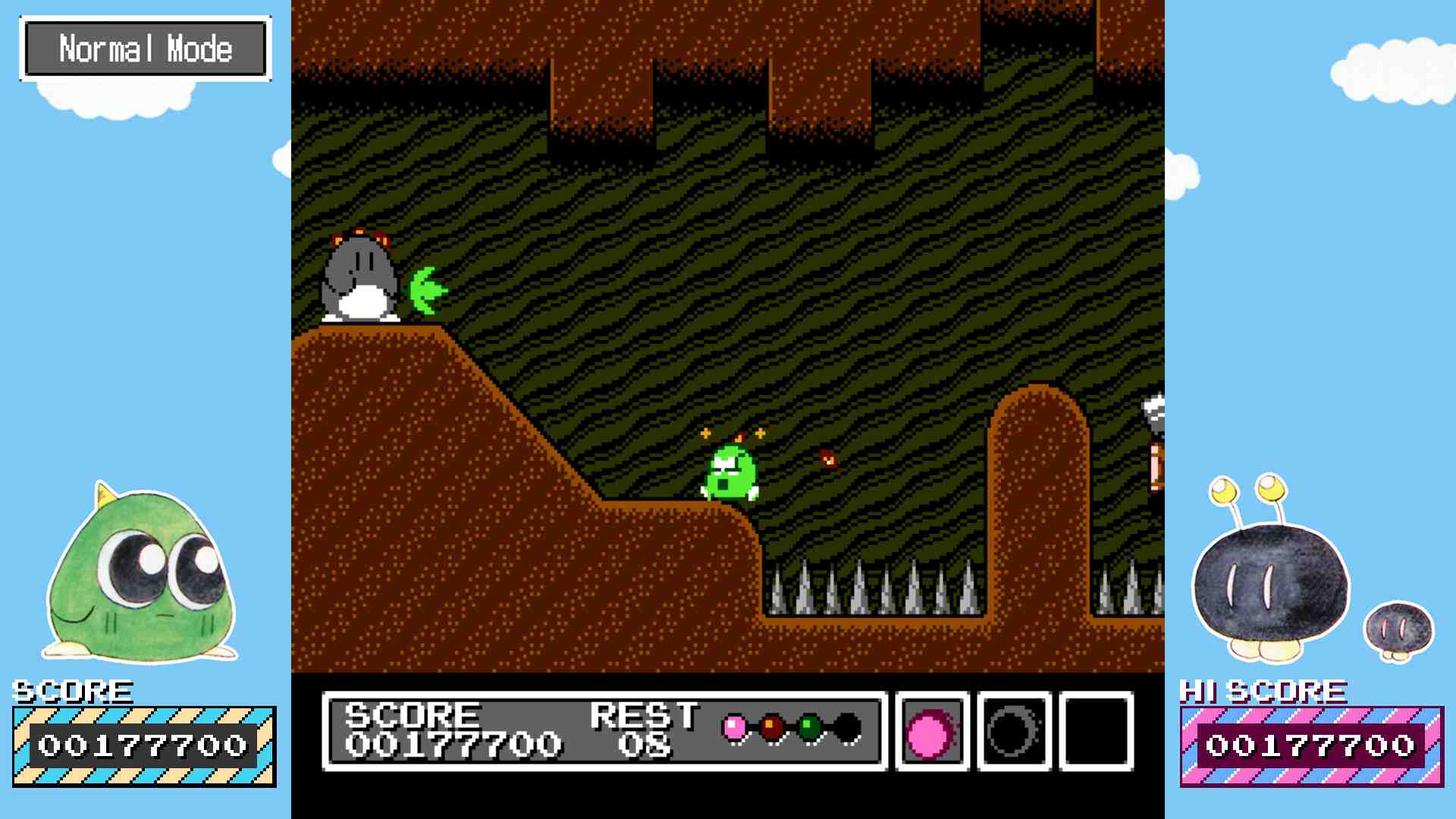 But you’re limited to 3 and the save and load times are surprisingly slow and while there are online leaderrboards for the speed run mode, there are no replays, which would have been amazing for that. The emulation seems bang on though, as it should be in this day and age. This game will test your mettle, especially if you want achievements, where you have to play it without any of the assists like rewind and save states. There’s really no other platformer that plays this way so hard as it is, if you want something different, you’ll definitely find that here. In its original form, Gimmick! was a brutally difficult game, and if you wanted to get the “true” ending, you had to beat (almost) the whole game without using a continue