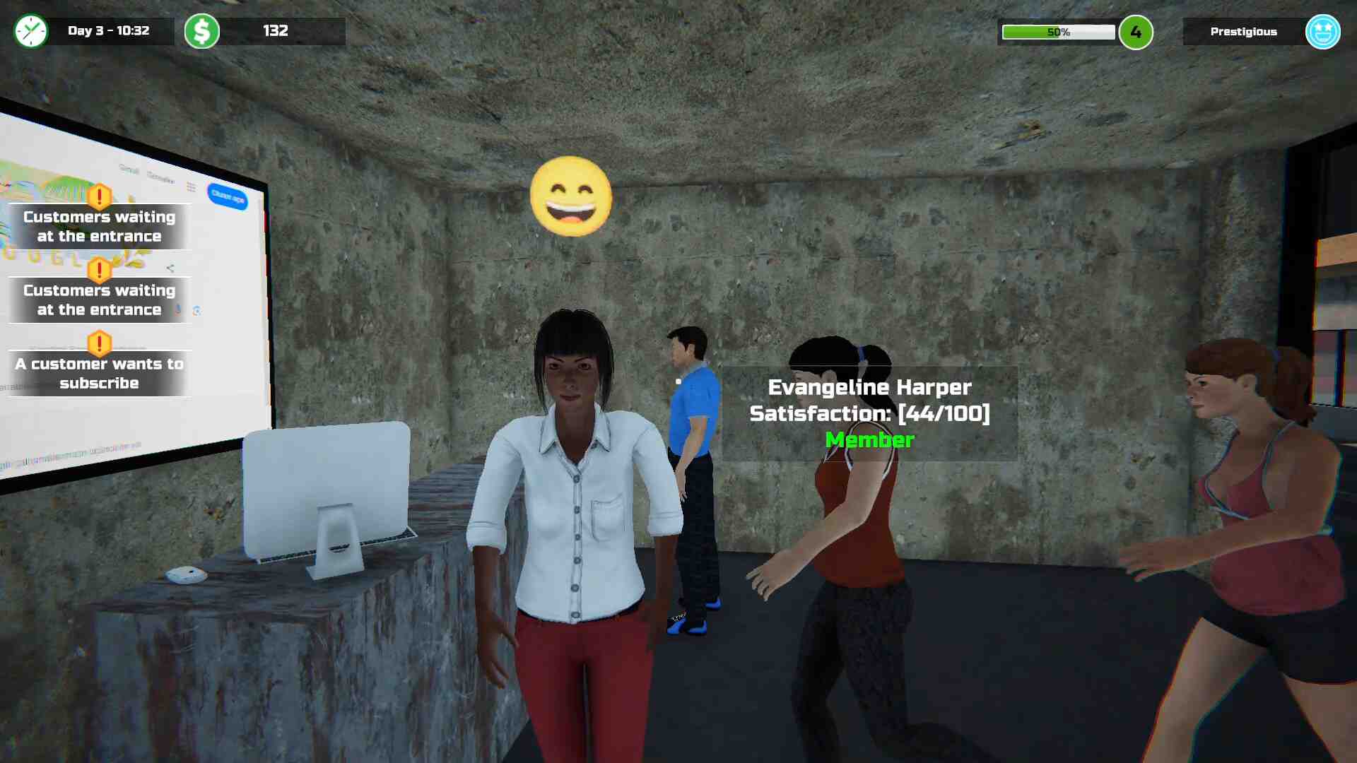 Build and manage your own gym: Design your gym to your liking by choosing the equipment, decoration, and facilities you want. Expand your gym by demolishing walls and opening new facilities like a sauna, massage salon, solarium, and locker room. Manage your members: Keep your members happy by providing them with high-quality equipment, facilities, and a clean environment. Bargain with members about subscription money by measuring their fat and prescribing them a diet in mini-games. Maintain your equipment, keep the gym clean, and deal with people who stir up trouble. Sabotage the competition: Take revenge on the gym owner who fired you by making their gym bankrupt. Sabotage their gym to increase your customers and profits. Popularity management: The popularity of your gym depends on various factors such as the cleanliness of your gym, equipment quality, ratings, music quality, and the ratio of girls to boys.