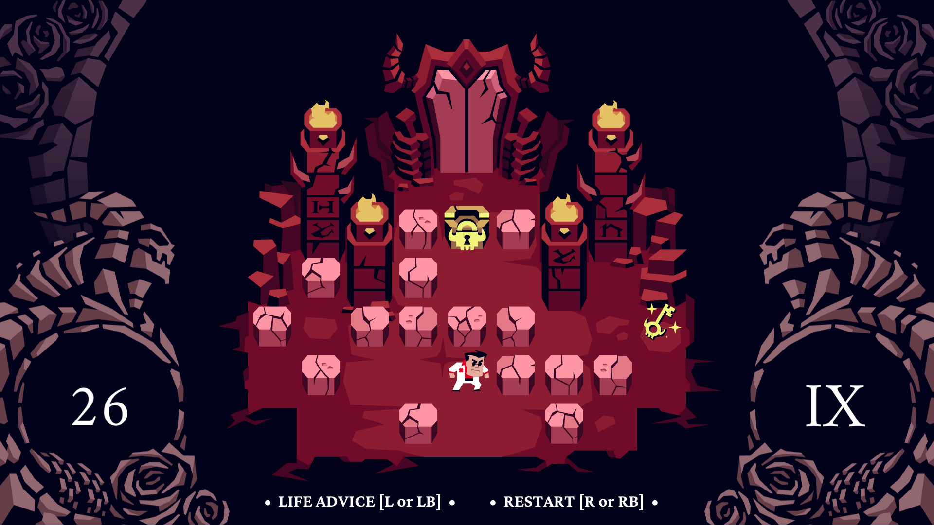 It has a very cool visual style to it and I love how the girls have a very naughty look to them without going the XXX route like many other games would have done. The gameplay of Helltaker is a lot of fun. This is a top down puzzle game where each level gives you a limited number of moves. The goal of each level is to get your demon girl, but you need to do things such as move blocks, collect items, and avoid death traps as you do. The game forces you to really think about each move before you start a level as some levels give you just the bare minimum moves to make it.