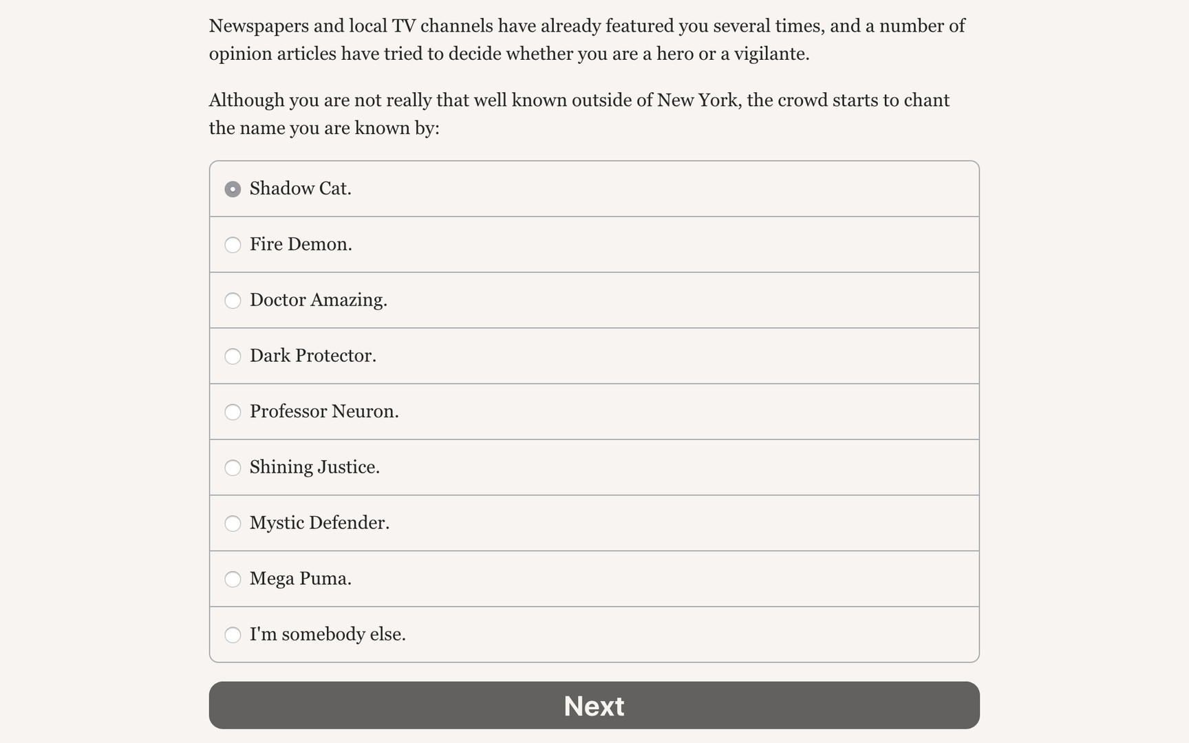 Become the greatest hero or villain that the world has ever known! Balance the challenges of leading a normal life, while attempting to defeat evil… or wreak havoc on the world. Hero or Villain: Genesis is a 330,000 word interactive novel by Adrao, where your choices control the story. The game is text-based, and while it has some artwork in it, your choices control entirely the outcome of the game. Will you hunt down villains to the last corner of the planet, join a group of fellow heroes (or villains!), defeat New York’s criminal mastermind, or even replace him? Choose from dozens of powers. You can pounce your enemies with the power of your fists, strike them down with hellfire, take control of their minds, dodge their attacks with your super-speed, or rewind time to learn from your mistakes. Build your own gadgets, improving the quality of your armour or the weapons mounted on it. Make alliances with other heroes, and attempt to find a side-kick that works with you. Play as male, female, or non-binary, and romance many of the otherĀ characters! Several illustrations to enhance your experience.