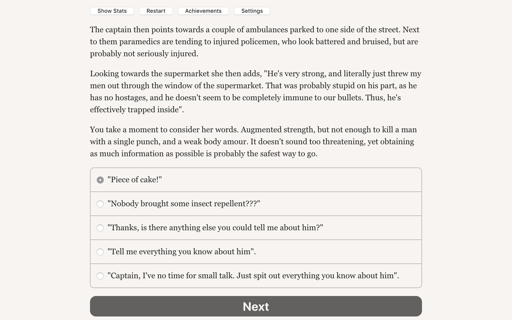 Become the greatest hero or villain that the world has ever known! Balance the challenges of leading a normal life, while attempting to defeat evil… or wreak havoc on the world. Hero or Villain: Genesis is a 330,000 word interactive novel by Adrao, where your choices control the story. The game is text-based, and while it has some artwork in it, your choices control entirely the outcome of the game. Will you hunt down villains to the last corner of the planet, join a group of fellow heroes (or villains!), defeat New York’s criminal mastermind, or even replace him? Choose from dozens of powers. You can pounce your enemies with the power of your fists, strike them down with hellfire, take control of their minds, dodge their attacks with your super-speed, or rewind time to learn from your mistakes. Build your own gadgets, improving the quality of your armour or the weapons mounted on it. Make alliances with other heroes, and attempt to find a side-kick that works with you. Play as male, female, or non-binary, and romance many of the other characters! Several illustrations to enhance your experience.