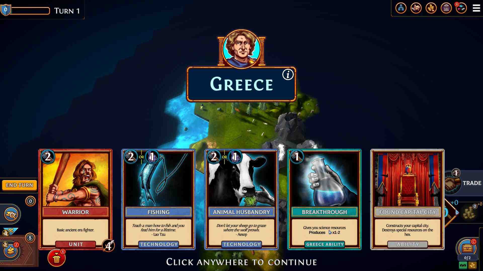 That is a way to inject difficulty, but it is one of the least satisfying systems to overcome. While I wouldn’t normally comment on hear-say, on default settings, the AI just refuses to exploit blunders. I get that good AI is hard to make, but it needs work. As a quick example, while fighting a war through my territory the AI kept killing my defenders in passing, but never actually stopped to capture the city they keep walking past. Their goal was some worthless, un-upgraded city held by a stronger rival. It would have been more fun for me (and more productive for the AI) if the AI were to capture my cities and force me out of the game altogether. The game is too short. This caused me a lot of difficulty early on. Gunpowder units by turn 9, wins typically under 20 rounds and frequently under 15. Even expecting a short (session-length) game, I expected a longer turn-count. This means that long-term planning is generally non-existent and you should focus on immediate needs over long-term growth.