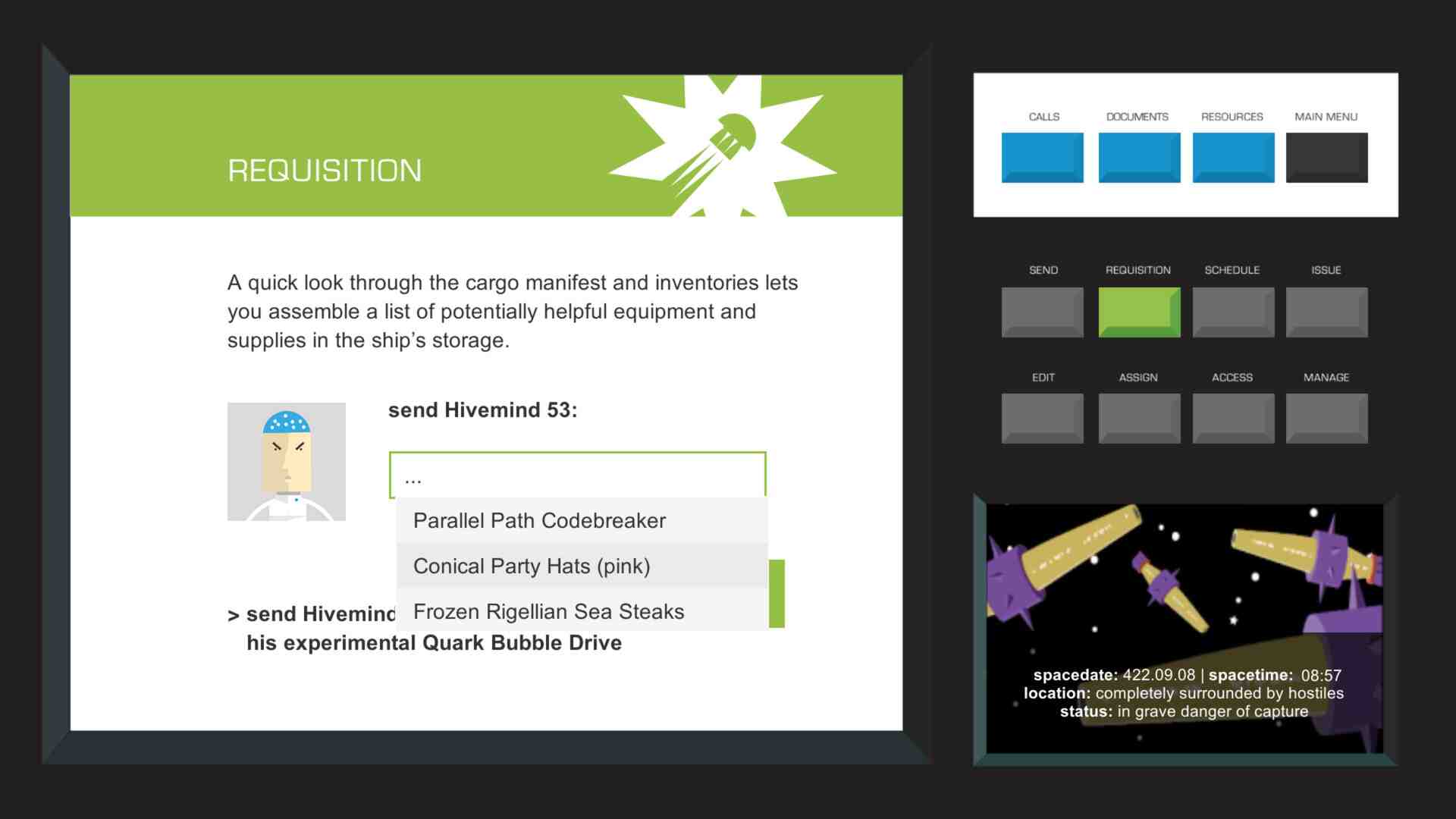 As disaster looms, you — the HRO — interact with key characters to investigate the crisis, identify possible responses and implement your preferred paper-pusher solution. Will your conversation with the criminally-insane physicist who has seized control of the ship inspire you to fake your own resignation so you can infiltrate his cult? Or, when surrounded by bloodthirsty Kirmulak warships, will you choose to transmit the stolen enemy command codes to disable their vessels and allow the Endeavor to escape? Save the day! Be the hero! The levers of administrative power — and the consequences of using them — are yours…