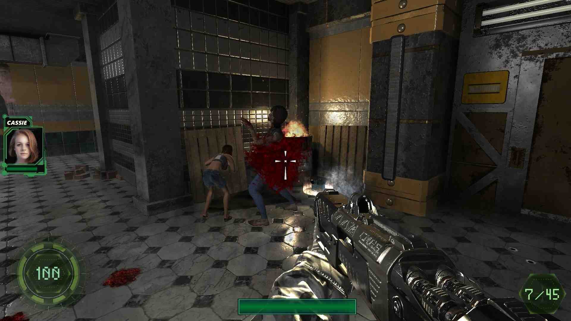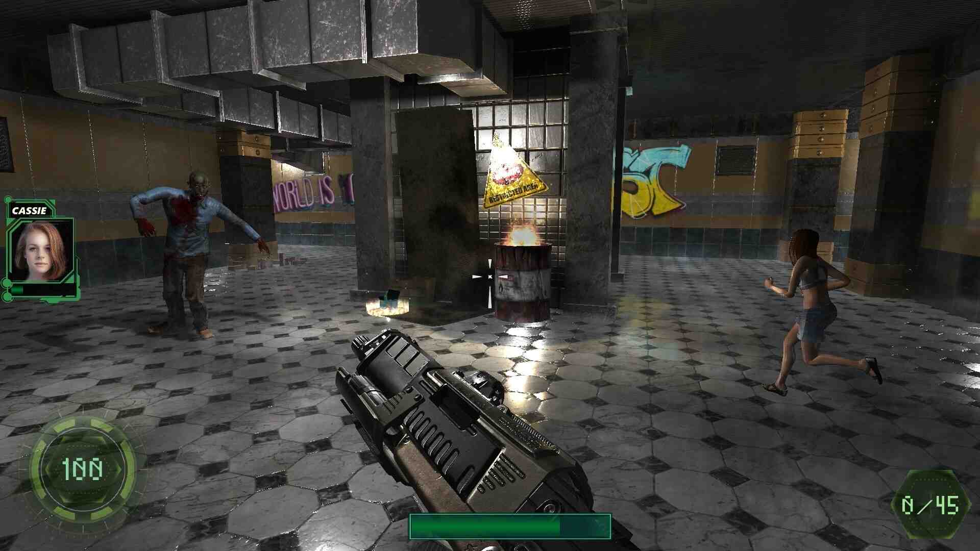 Outside is 2043. Humanity is suffering from a zombie virus and hiding in basements, suffering from hunger and disease. The plot tells the player the story of the mercenary Dorian Stealth, who is given the task of rescuing a young girl – hacker Cassie Jefferson and delivering her to the Investment Corp. The two of them will have to go through many tests and break through the crowds of distraught zombies. Dynamic 3D shooter with elements of a quest and puzzles. Dorian carries certain types of weapons with him: Knife, Shotgun, Grenade Launcher and Kalashnikov. The knife is good at close range, the shotgun at medium range, but requires reloading. The grenade launcher creates a large explosion and is capable of hitting multiple enemies at the same time. The machine gun is a universal weapon, but its ammunition is extremely limited. Using the tactical superiority of each weapon, defeat the hordes of monsters and bosses!