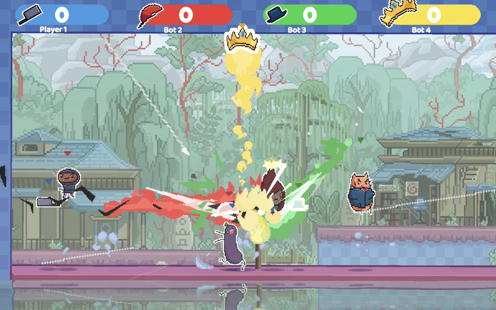 King of the Hat is 2-4 player 2D party platformer where you fight with a hat! Throw your hat to attack, defend and bait opponents. But watch out! If someone jumps on your hat… you die! In King of the Hat, your hat contains your soul. Crush your opponent’s hats (and souls) to assert your dominance over them. When you throw your hat, it goes on fire and becomes invulnerable. You can use it to beat the devil out of other players or to defend against your opponents’ flaming hats. Although the basic mechanics are easy to pick up and play, King of the Hat allows for deep, hat-tastic competitive play as a 2 player game. It’s an amazing casual game that is so easy to pickup. You just throw your hat to hattack and crush theirs to win, but if yours gets crush you lose. It’s that easy! Even recommended to those who are new to gaming or for young children. However, in its simplicity, it’s skill ceiling is high due to characters’ unique tool-sets and their techs, and how punishing and rewarding in top plays. If you’re fighting against a very competitive player, getting hit once is incredibly hard to recover and will result in losing that round. It even has ROLLBACK NETCODE. Making causal and competitive online games fun!