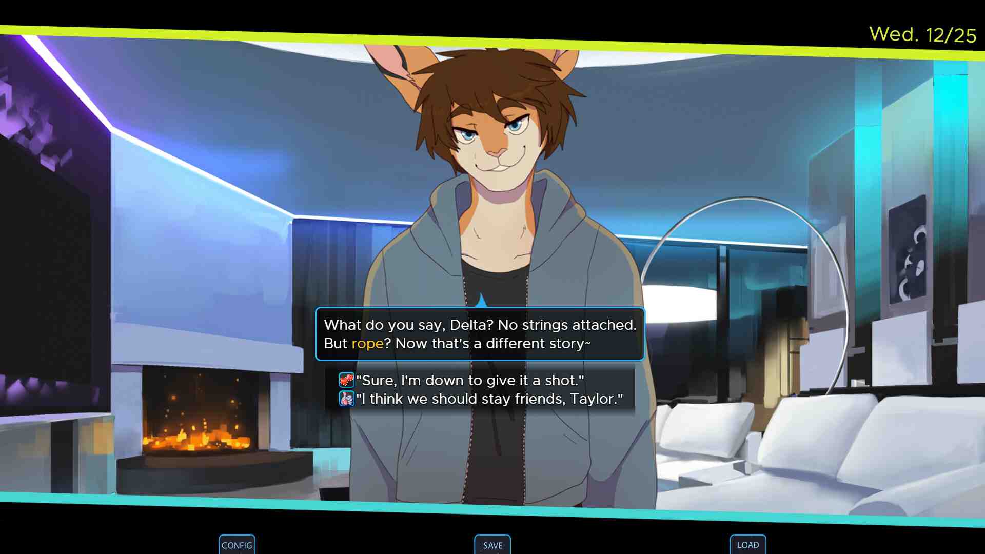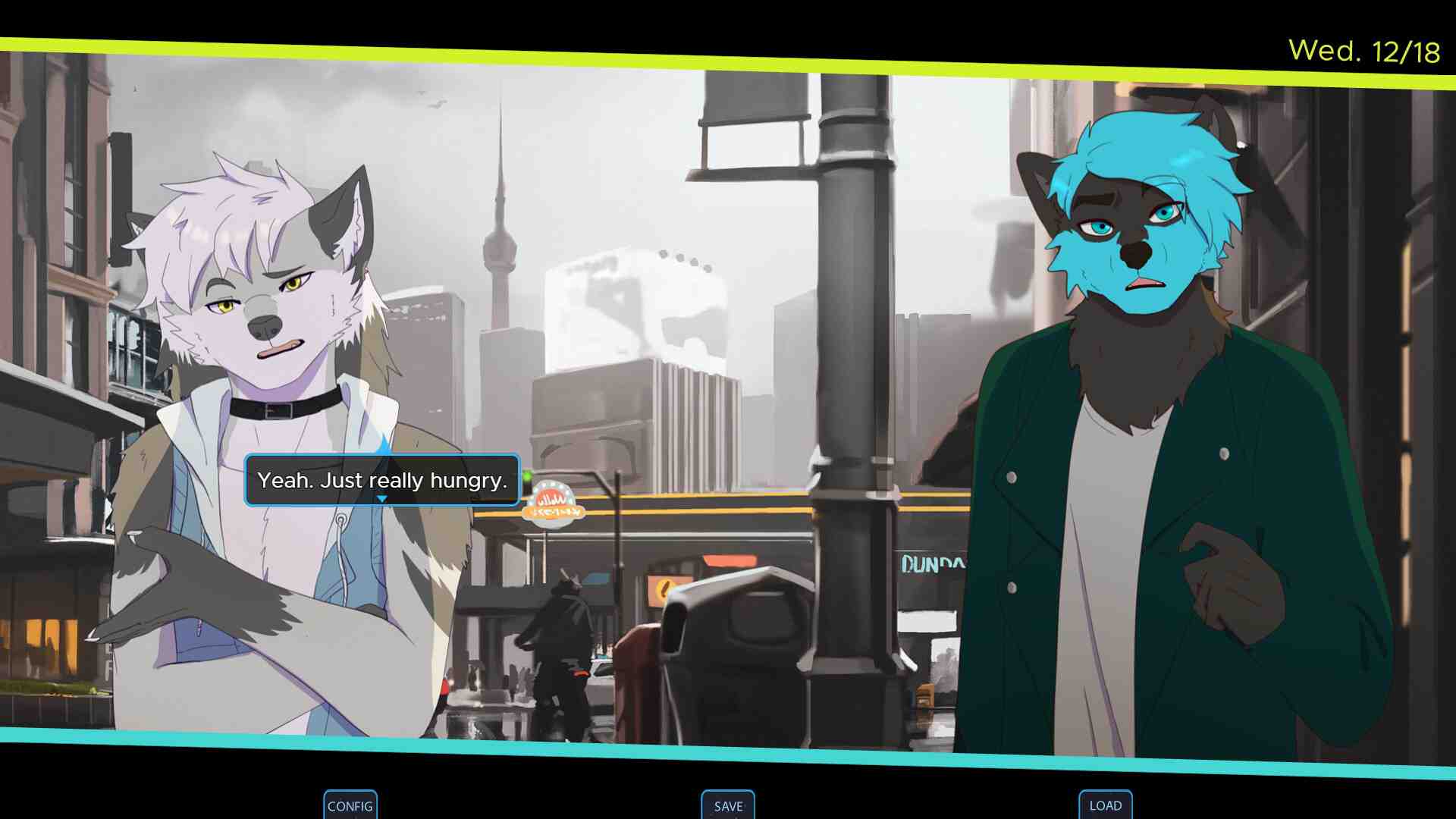 Komorebi is a fully voice acted dystopic story taking place in 2041. Set against the backdrop of social revolt, you move to Toronto to start a brand new chapter in your life. Make friends, party, and form bonds and romances that will last a lifetime! While pages turn in your life however, they also turn in the world. As your morals clash with those in power, you and your group may walk an irreversible path in the name of equality and a brighter future. First off, I have to say that the characters were the heart of this game. They’re so lovable and well-written, each with their own personalities and struggles. The characters and voice acting – spot on! They really bring life to the story, and Legoshi’s VA stood out to me, but hey, that might just be my bias. I wanted to romance them all! I love visual novels, if ya know me, you know this. However to be blunt, I did find myself a bit disappointed with the protagonist, Delta. They felt a bit bland, and I couldn’t really connect with them. I also felt that some characters suffered from the “tragic backstory” syndrome, and well that’s just to be expected here.