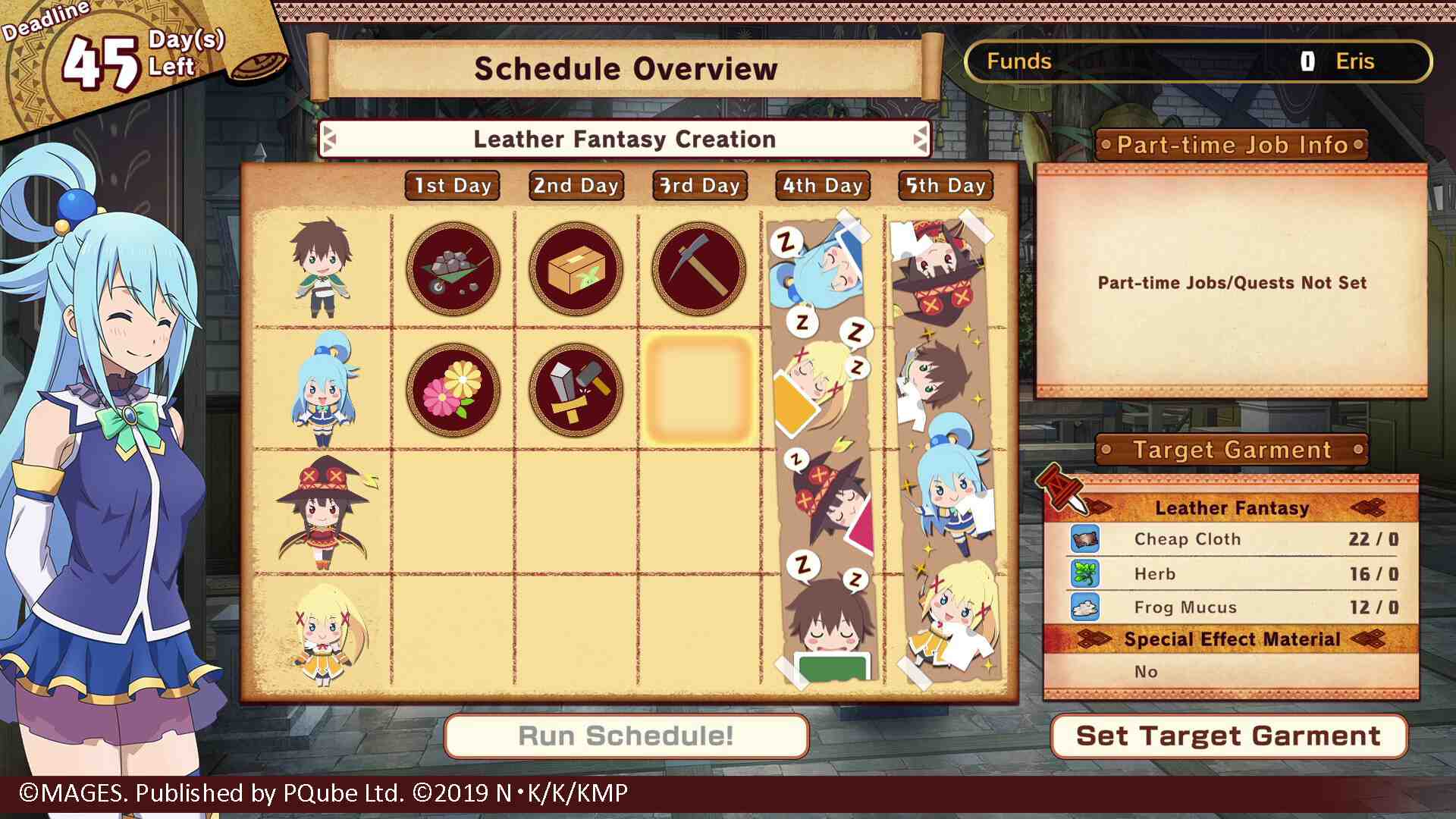KONOSUBA , the video game, has an original narrative from its already-established lore. Introducing each character as the crew is trying to fulfill a quest to kill as many monsters as possible, and, as per usual, shenanigans ensue, and something goes horribly wrong. There is even a transitional slide in between scenes to make it feel like you are actually watching the show. As is the nature of the visual novel genre, you have to fill in the blanks with some of the action that is going on in KONOSUBA with your imagination, as they are just standing there describing the action to you with its stellar cast. for Kazuma to go to to spend a little free time. These choices may just give him a chance to move the plot forward and stretch his legs, but, because this is a visual novel of massive fanboy proportions, this is also how you might have a chance encounter with one of the many women. All chapters are based around having to create one specific outfit with a star marked next to it, and each four of these will end once you can deliver the outfit, inching you closer to its dramatic and singularly unconventional ending, characteristic of the series.