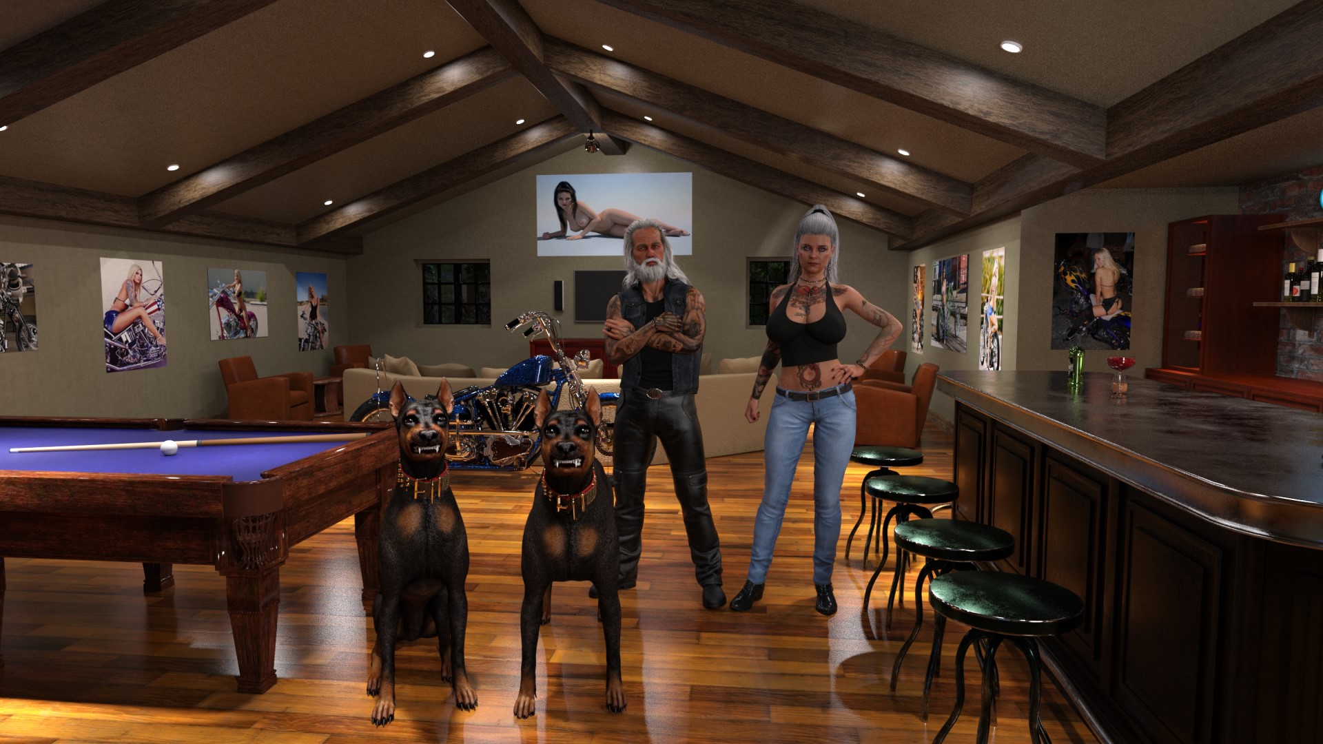 Great concept. Great writing. A great job all around, can’t wait to see more! Keep up the amazing work! This is one of the freshest concepts I’ve seen in a while, and I am so happy with the incredible amount of content already in the game. Excellent game. Sons of Anarchy vibes. I’m sure that’s what the dev was going for here. Gorgeous girls and really good story so far. Not sure what if any story branching there is as I haven’t tried different playthrough yet. Phenomenal game. The models are very well done. There is a wide range of body types. The dialogue is obviously written by someone a little older with lots of pop culture references. The flow of the game is excellent, there is always some action not too far around the corner.