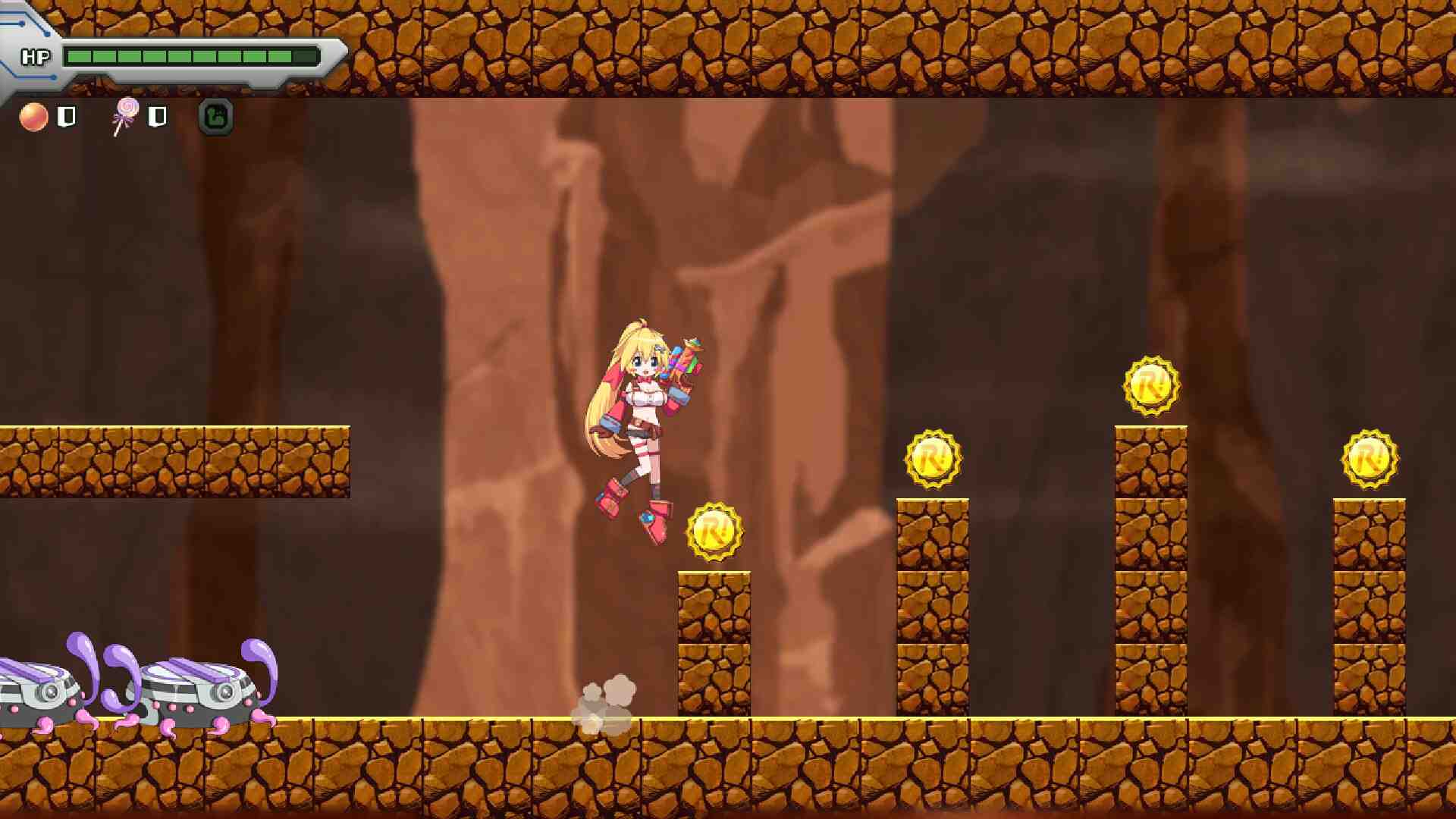 Resta lives happily as an inventor in a small city. But her normal life is shattered when the robots around town go berserk and begin wrecking everything in sight. It’s up to Resta and her good friend Curie to uncover the truth behind the incident and put an end to the chaos! Navigate through the side-scrolling maps and defeat your enemies with your trusty gun! There are all kinds of enemies with a wide range of attack patterns, so tread carefully! Exciting Boss Fights Each level contains a unique boss fight to challenge your skills! Variety of Weapons There are a number of weapons to unlock, each with its own functionality. Collect them all! Engaging Story Discover the truth behind the robot incident as well as Frezero’s real motives!