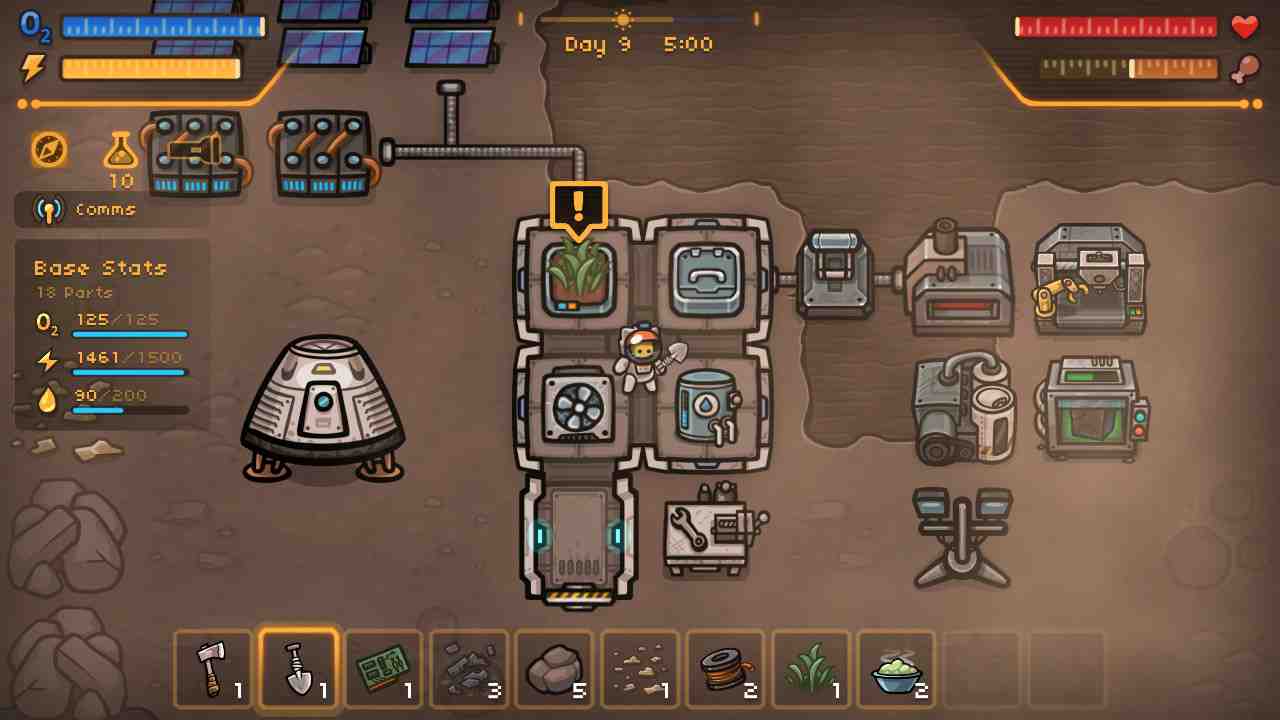 MewnBase is a cute, 2D exploration/survival game. You land on an uncharted world only to realize you didn’t bring any snacks and forgot half your luggage. But hey, at least you brought this workbench thing. You’ll need to collect resources in order to construct a make-shift base. Craft a variety of different base modules, from airlocks to rain-water collectors in order to make your new home on this barren planet a little more cozy. Technology Upgrades Find strange, yet oddly familiar artifacts scattered around the planet. Research them to unlock shiny new crafting recipes and tech upgrades. Manage Your Base’s Resources Build air cleaners to keep you breathing. All those modules plugged into a single outlet probably won’t cut it. So you’ll need more solar panels to keep things humming along. Keep a supply of clean water on hand to keep your plants hydrated. Day/Night Cycles and Weather Hazards It’s hard to find your way in the dark.