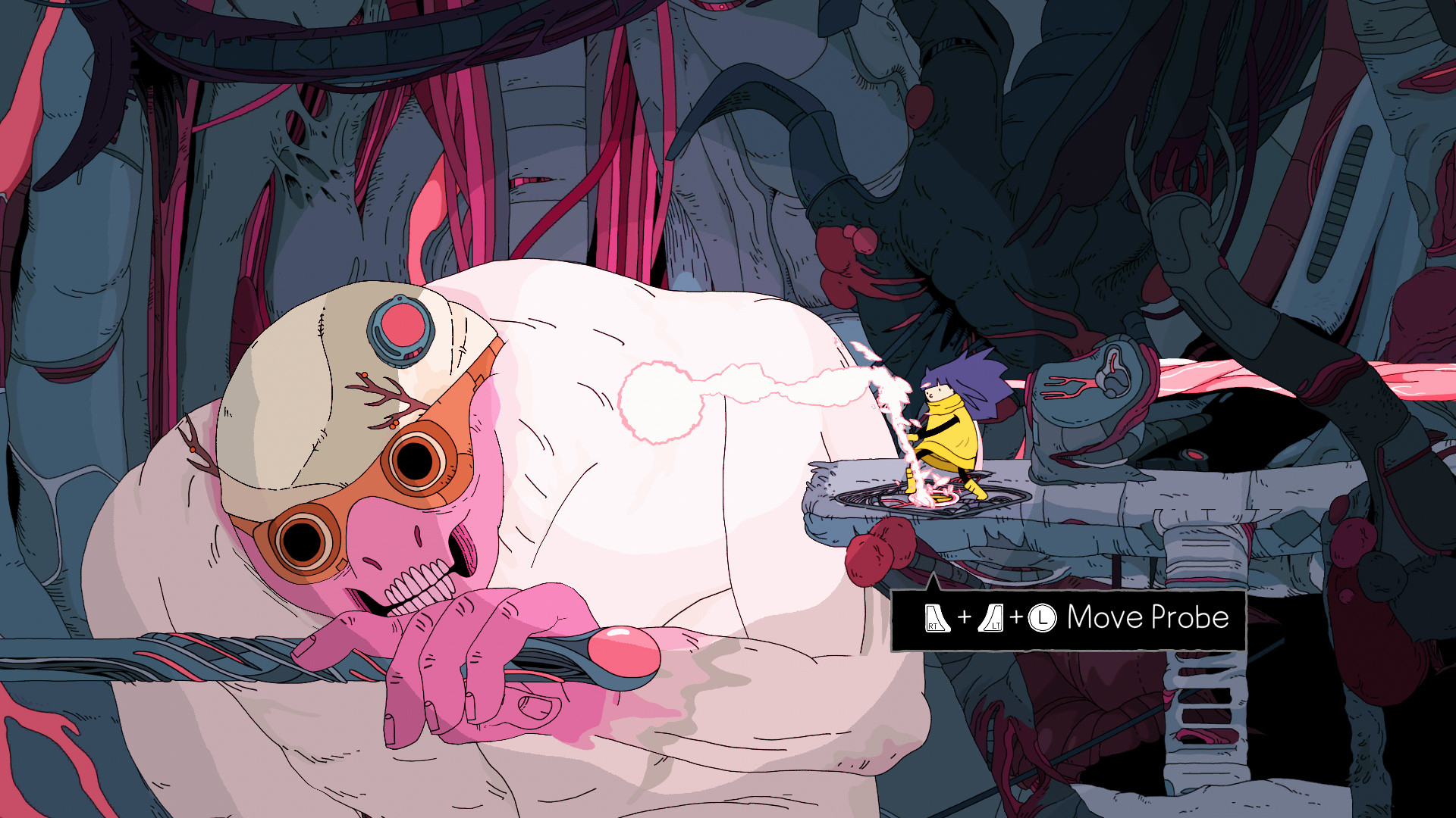 You play a girl with blue hair and yellow shoes, tasked with keeping vital biological-mechanical machines running in a devasted – and mostly deserted – world. Four giants power the machines, and when the game begins they have stopped working. So you grab your Omni Switch and look for the reason, which starts a long, linear journey during which you have to travel between the islands to get everything in working order again. The world is mostly deserted, covered by poisonous spores that kill unprotected humans (and animals). You’ll encounter withering plants, animal carcasses and the the story is told by the calming voice of the narrator, while the few humans you meet don’t talk that much. You can run, jump, crouch and climb, but the game is designed to be playable by everyone. Even if you miss a platform, there is no fall damage when you glide down with your dress that works as a parachute. The spores might eat humans and animals alive, but you are quite resistant and are only in danger in areas with a high concentration of spores. In such areas the spores might poison your mind and induce a little delirium – but you know how to escape back to reality.
