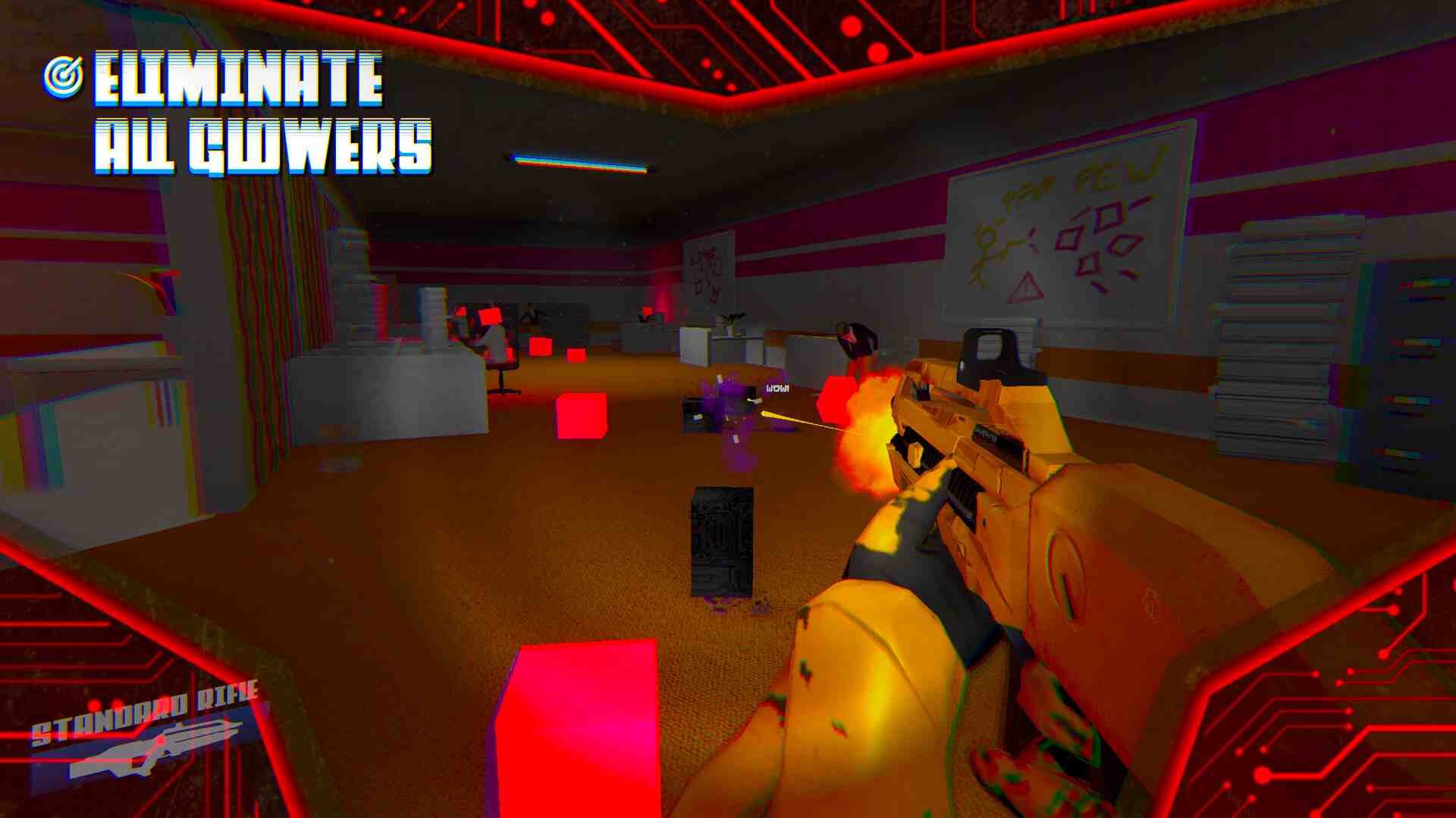 More Enemies has been called the best video game of all time Starting at a dead-end job for an obscure paper company with no story relevance, you venture onto your next job as an employee at… Lollygag Labs. A game development company with questionable ethics! Where you uncover a plot of spoilers, deviance, gore, dangerous chairs, and of course: enemies MORE ENEMIES is a single-player first-person shooter and exploration game with exciting weapons, interactable characters, and plenty of exciting environments from offices to secret bases in a story-driven campaign where you have to try to survive glowing cubes to being exterminated to getting eaten by giant mutated monsters! Bringing on fantastic new voice talent and all that other good sh*t, MORE ENEMIES will truly have you falling backward in your gaming chair! MORE ENEMIES is a humorous and surrealistic first-person shooter with some adventure and horror elements. It has a good length – about 1,5 hours to play.