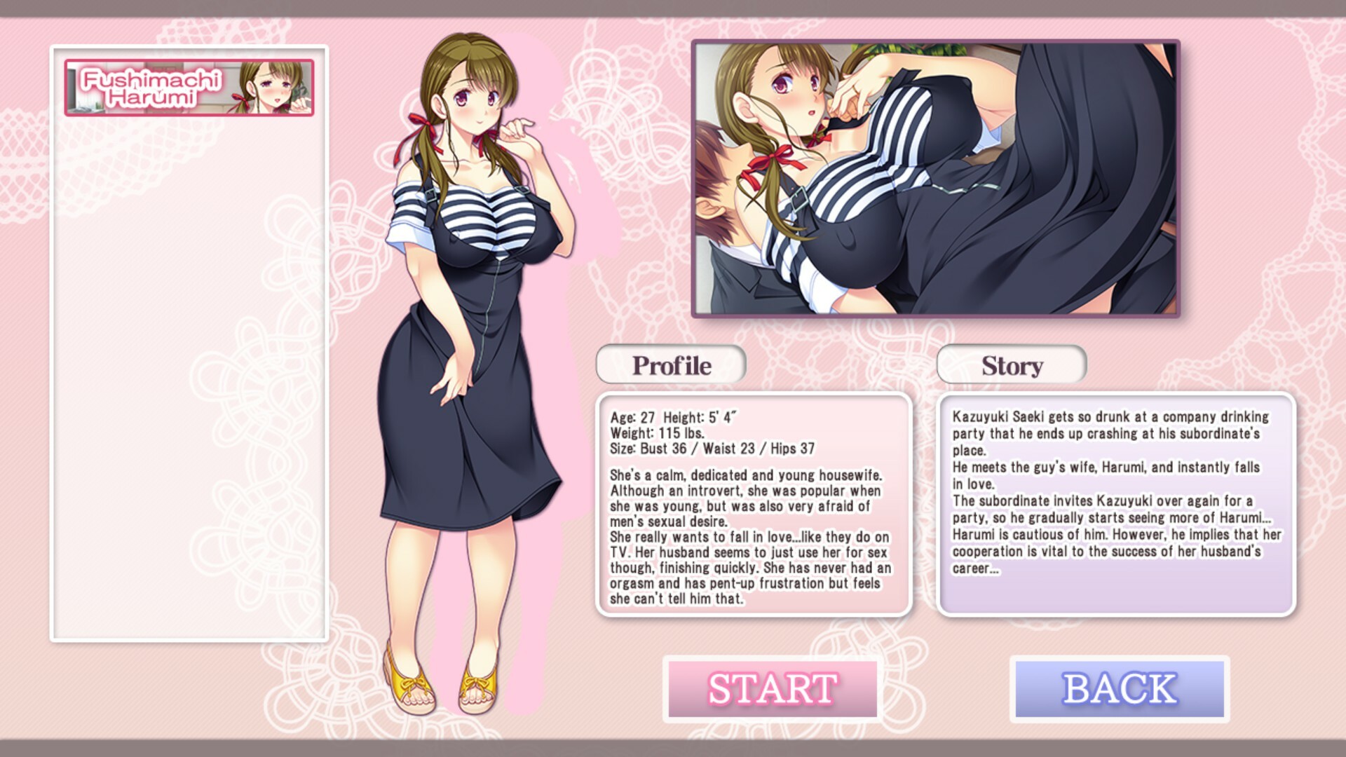 A variety of episodes, such as flirting or playing with a man, are featured in this game. This game is a visual novel. Unforeseen events occur in a housewife’s life, the seduction of lonely women and relationships between couples, etc. A variety of events occurring in different women’s lives is depicted. All of the heroines are enjoying their lives. But, each one has a hidden secret. The main character discovers their secrets and manipulates them to be obedient to him. They project a life of happiness in public, but actually reveal their humiliation and erotic pleasure in private with you. You are the only one who will know! This is the main game for accessing each heroine’s story in Obedient Women. You will need to purchase additional episodes as DLC to play each episode. More additional episodes of DLC will be added in the future.