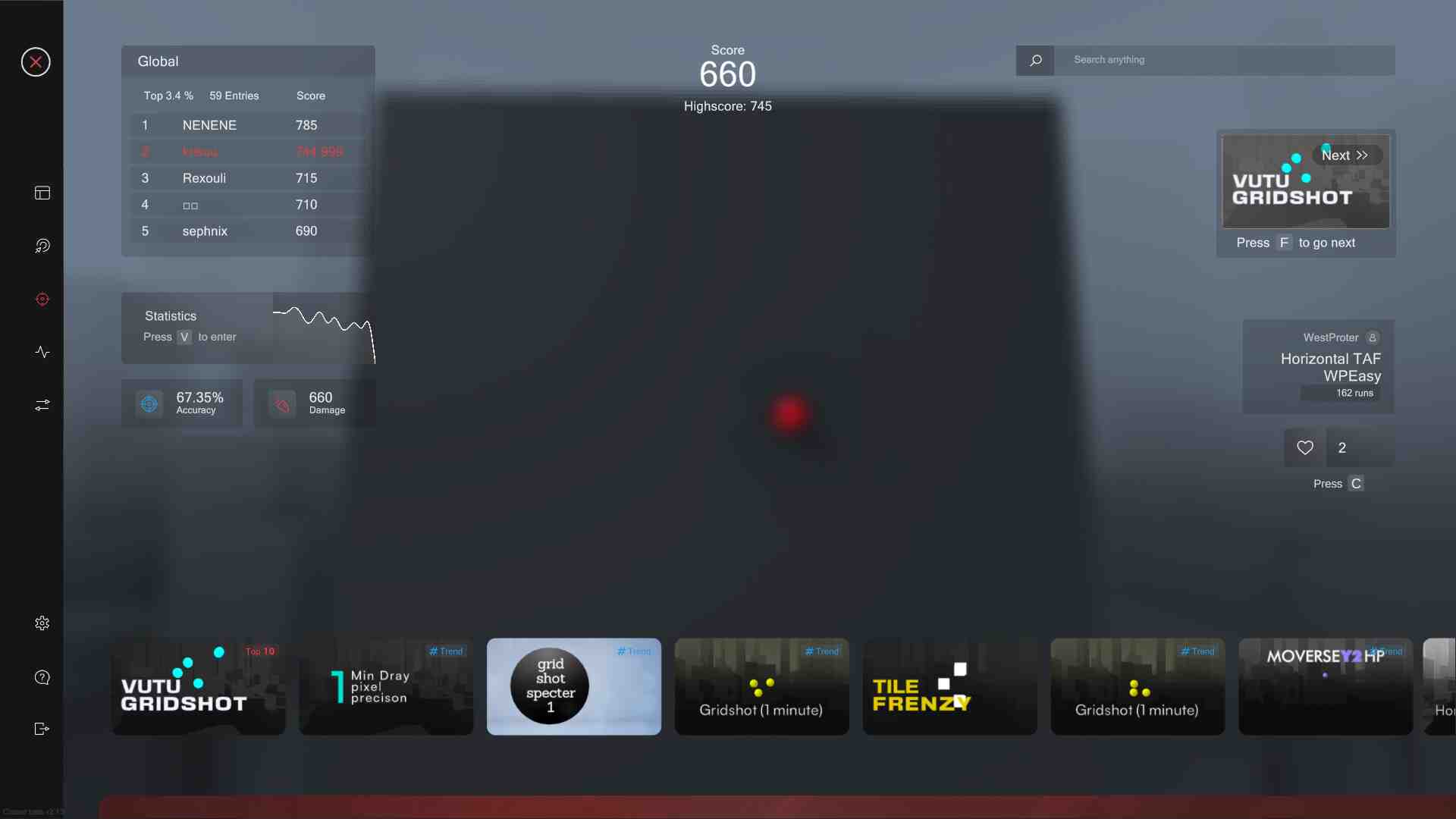 Smart Play is the perfect place to discover new scenarios. Just click “Next” and we will pick the following scenario based on your liking and preferences. After your training session, you can immediately view the statistics of your runs in the analysis section. Oblivity provides as much data as possible to show where you have weaknesses and do aiming mistakes. This includes the usual information like accuracy, mouse speed and score. But you will also see data such as the deviation from the ideal aiming path, overshoot, undershoot or aiming smoothness. Every run can be rewatched with the replay tool. The timeline shows, where you did which mistake. Be it over- undershooting the deviation or your overall performance. The playback speed can be adjusted to any level. You can also turn on onscreen indicators that show your aim line compared to the optimal aiming path. Oblivity also offers a converter.