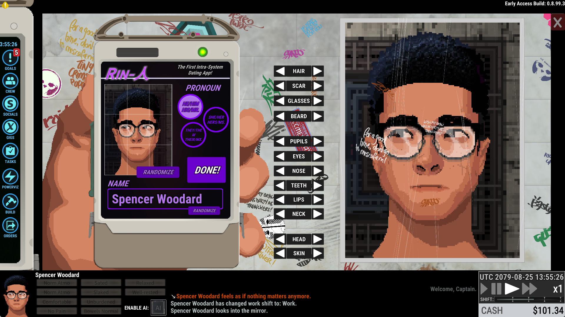 Ostranauts is a noir spaceship-life sim, in a solar system cut-off from a ravaged Earth. It takes place in the same universe as Blue Bottle Games’s previous game, NEO Scavenger, and at approximately the same time. Create your captain. Design and fly your custom spaceship. First person, hands on controls and immersive ship interiors. Hire crew and take care of their needs. Then manage your dysfunctional crew and ship as you fend off bankruptcy…or worse. In character creation, you’ll use a Career Kiosk to craft your character’s history, qualifications, contacts and income. The background you choose for your character will affect their abilities and traits, which you can customise at the Self Care Kiosk. Backgrounds will allow you different skills and options in conversations. You’ll start out the game with enemies, ex-lovers and acquaintances to seek out… or avoid.