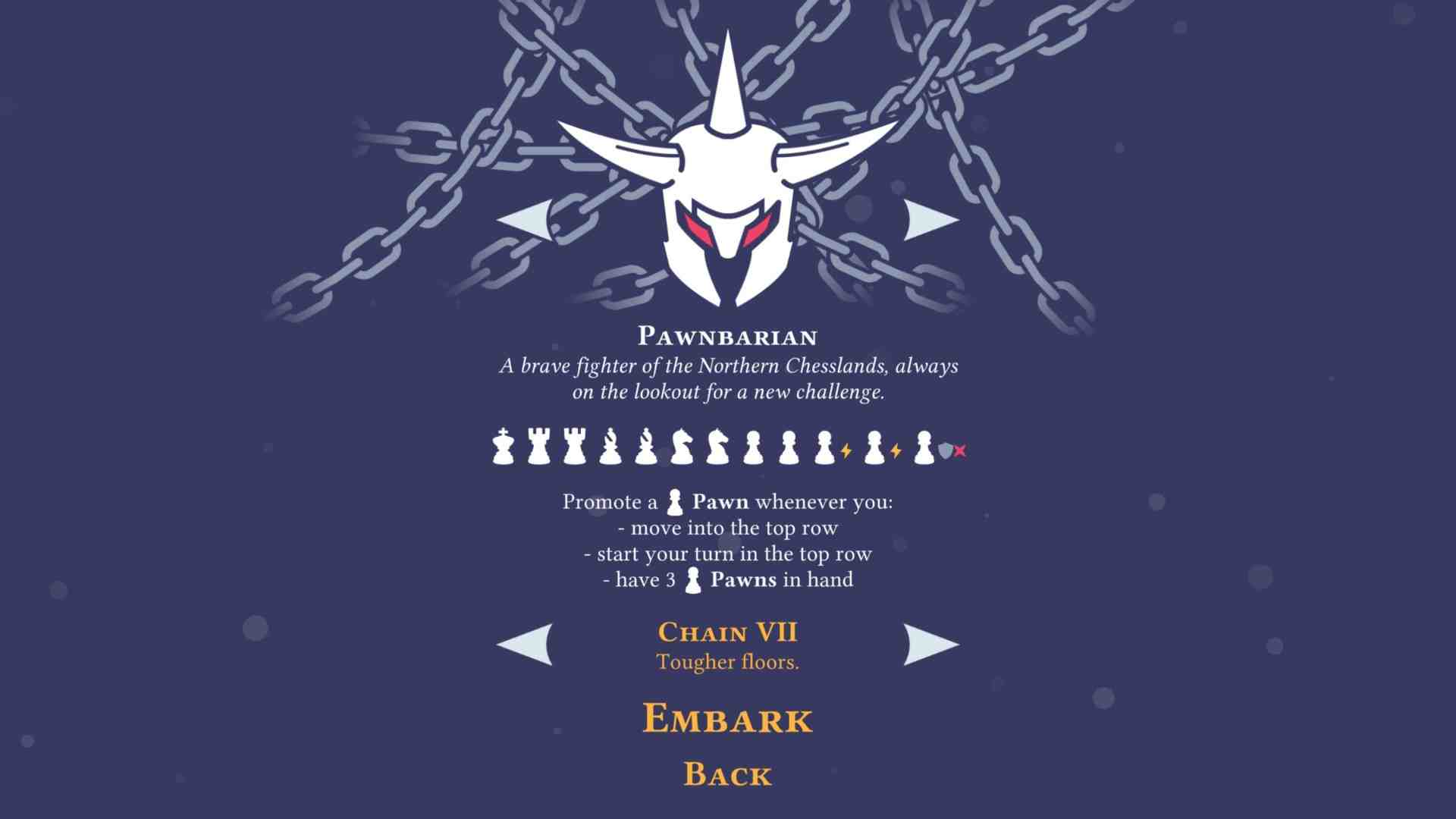 Pawnbarian is a turn-based puzzle roguelike with bite-sized, but challenging sessions. Play cards to control your hero like a chess piece on a tiny dungeon board, outmaneuver enemies with their assortment of tricky abilities, and become the mightiest warrior of the Chesslands! Use a deck of chess pieces to hack and slash through hordes of monsters. Pick up the basics instantly if you’re familiar with chess, or learn in minutes if you aren’t. Carefully plan your moves to navigate challenging, emergent tactical situations. Spend treasure to upgrade your cards with additional powers. Blitz through quick 15-30 minute runs – or die trying. Take on the infinite post-run Gauntlet to see how long you can survive.