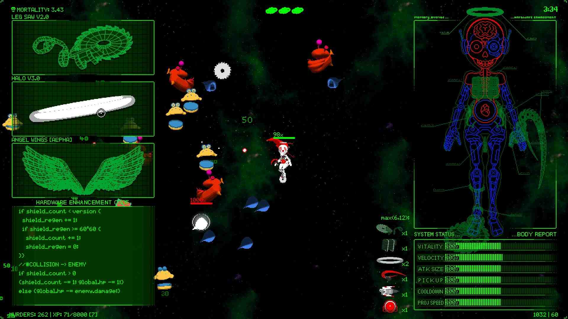 I feel like Picayune Dreams is surprisingly innovative in that regard, providing both flavour and features to keep things interesting. While i’ve played through five or so autoshooters so far (including the OG Vampire Survivors) I think this one is the one that stands out the most to me personally. I have not yet reached the end of the story so I am not sure about it’s conclusion, but so far i’ve really enjoyed the couple scenes i’ve gone through. Even if not much ends up happening plot-wise it just feels like a cherry on top to the rest of the experience, and the memories can be skipped if you don’t want to bother. The upgrades are entirely told to you through the game’s raw code, which is a fairly controversial feature, but I like it because it’s flavourful and gives you a ton of information if you know how to read it.