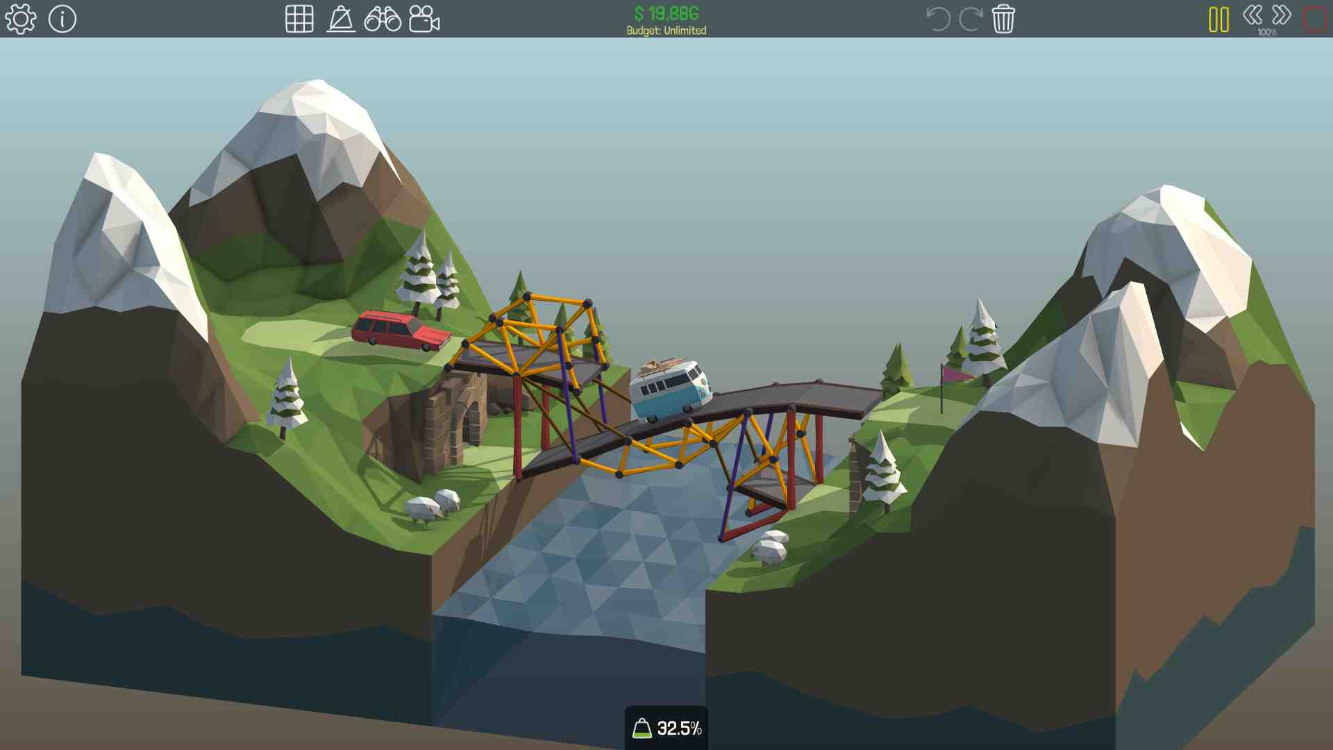 The game challenges players to design and build bridges that can withstand the forces of nature and allow vehicles to safely cross over bodies of water or other obstacles. Players must use a variety of different materials and design elements to create bridges that are both functional and efficient. The gameplay of Poly Bridge revolves around designing and building bridges that can withstand various forces, such as wind, water, and weight. Players must use a variety of different materials and design elements to create bridges that are both functional and efficient. The game offers a wide variety of puzzles and challenges, each with its own unique set of constraints and objectives. Players must use their creativity and problem-solving skills to overcome these challenges and successfully build their bridges.