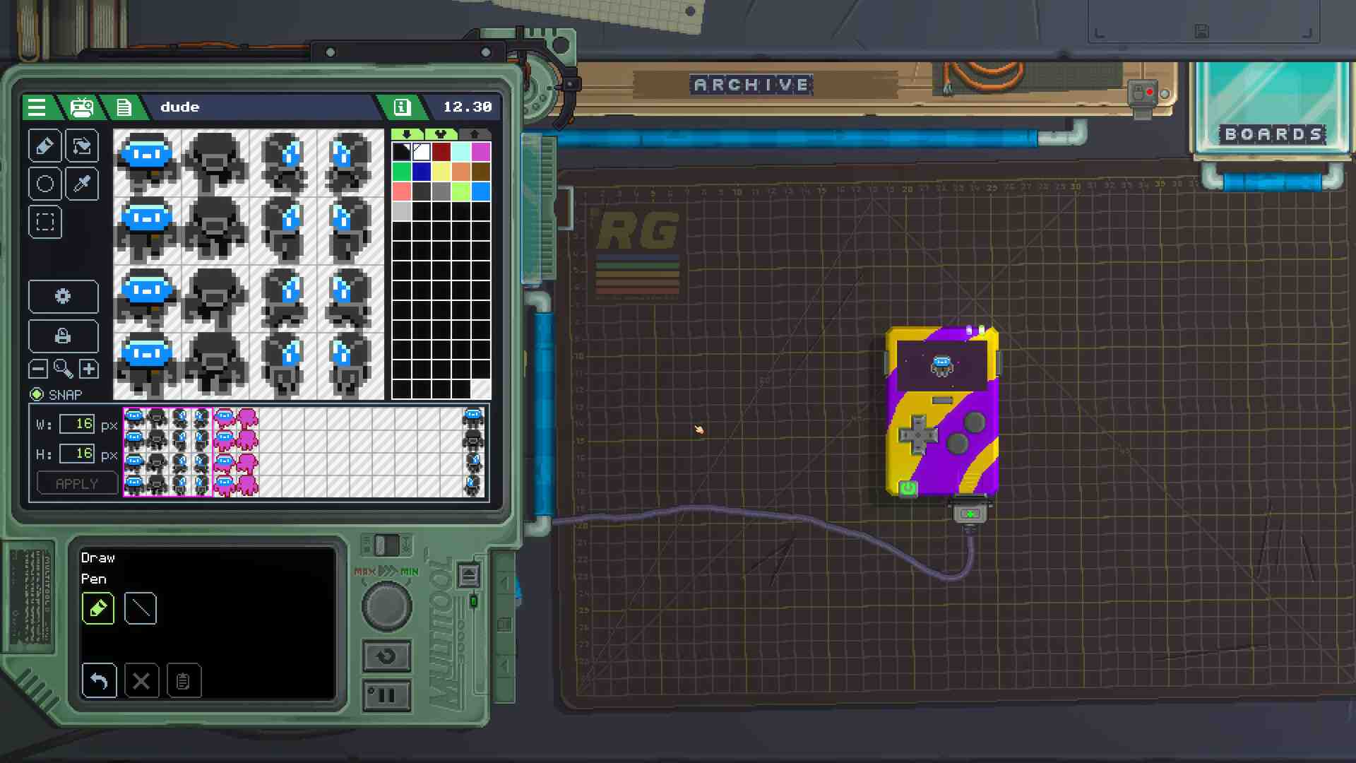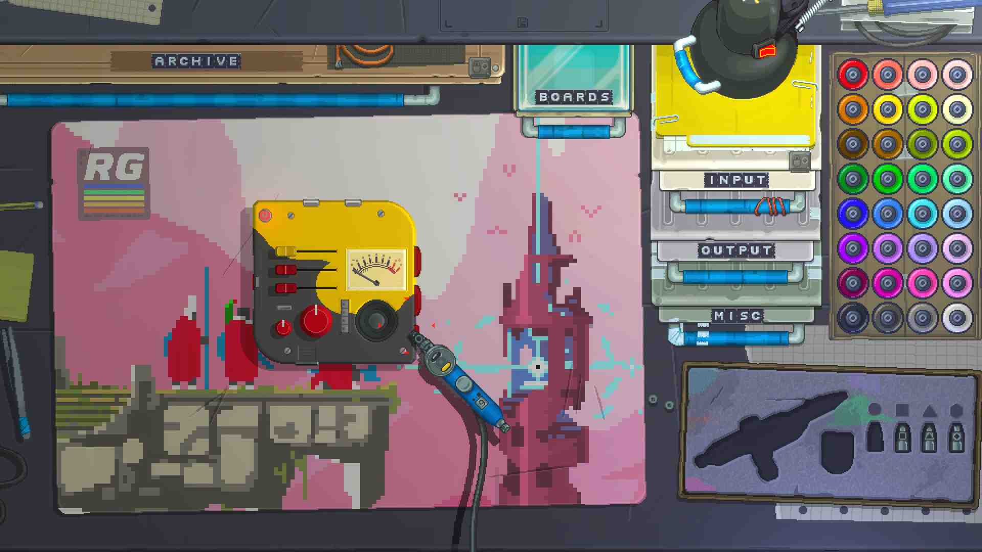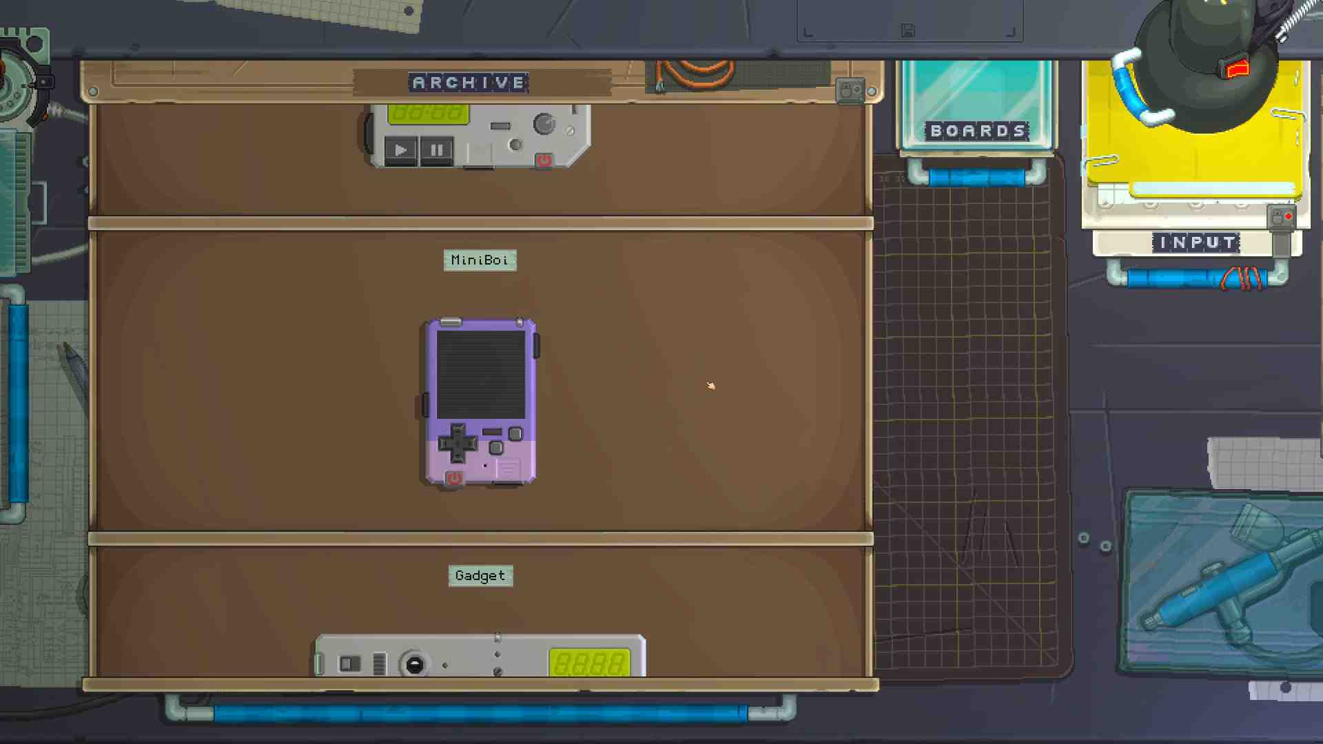 A World of Gadgeteers Check out gadgets made by people all over the world. Download any gadget, play with it, take it apart, see how it works, build your own version. Is the world ready for your awesome gadget? Cosy Workbench Tinker, test and lose track of time at your friendly pixel art workbench. Everything feels tactile and satisfying to use. Open drawers to find what you need. Solder and paint. Print and place stickers with tweezers. Connect parts with magnets. Twist knobs, tap buttons, flick switches. Trust us, you’ve never played anything like this! Unbeatable Components There is an ever-growing collection of buttons, switches, dials, gauges, lights, LEDs, LCDs, chips, joysticks, speakers, circuit boards, and more. Everything you need to create a lean mean sexy machine. Now, all it needs is a name! Striking Styles Make your gadgets feel truly personal. Connect boards to make new shapes. Spray components with different colours. Design and use stencils to create unique designs. Draw, print, and apply your own stickers. Or upload a logo for that more professional touch!
